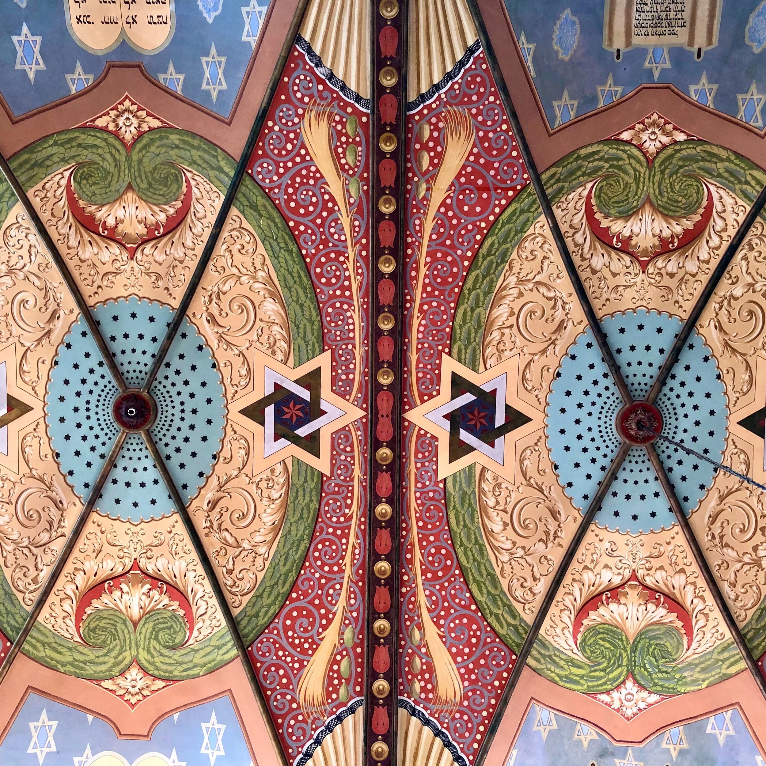 The interior contains a rather plain assembly hall on the first floor, but the sanctuary located on the second floor is impressive, said to be modeled after a synagogue in Lithuania. Make sure to look up at the vaulted clerestory ceiling intricately painted in hues of rust, mustard yellow, blue and green. An elaborately carved platform stands in the center of the room and faces the richly ornamented aron kodesh, or holy ark, surrounded by folk art elements typical of Eastern European villages. The sacred Torah scrolls were once kept behind the blue velvet curtain panel embroidered with silver thread.