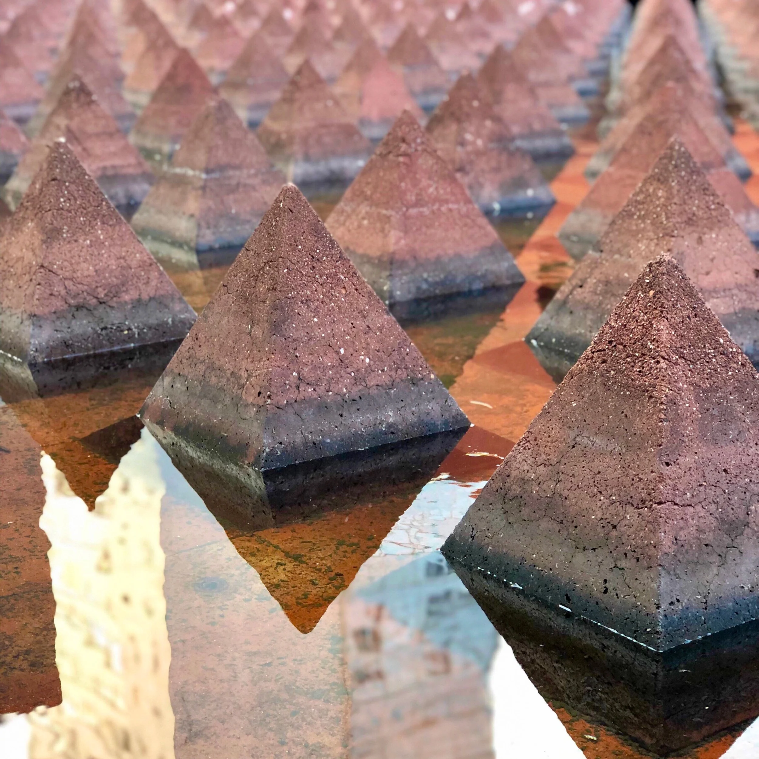 Across from Alameda Park, tucked into the courtyard of the Museo Memoria y Tolerancia surrounded by governmental offices is a fountain designed by Mexican visual artist Vicente Rojo and architect Ricardo Legorreta. Titled País de Volcanes (Country of Volcanoes), it features more than 1,000 small burnt red concrete pyramids emerging from a sunken reflecting pool, a reference to the coarse volcanic tezontle stone widely used by the Aztecs. –Duke