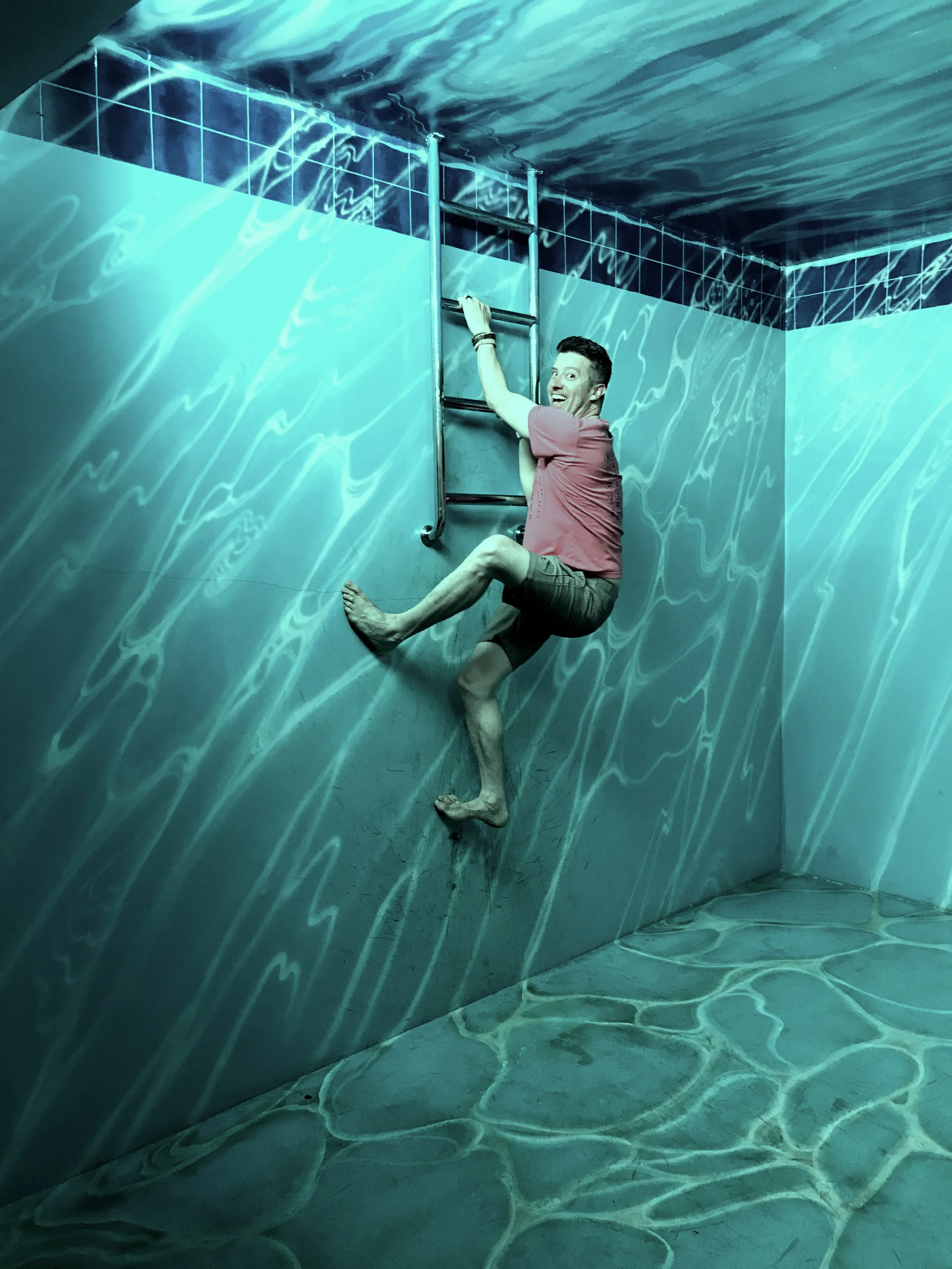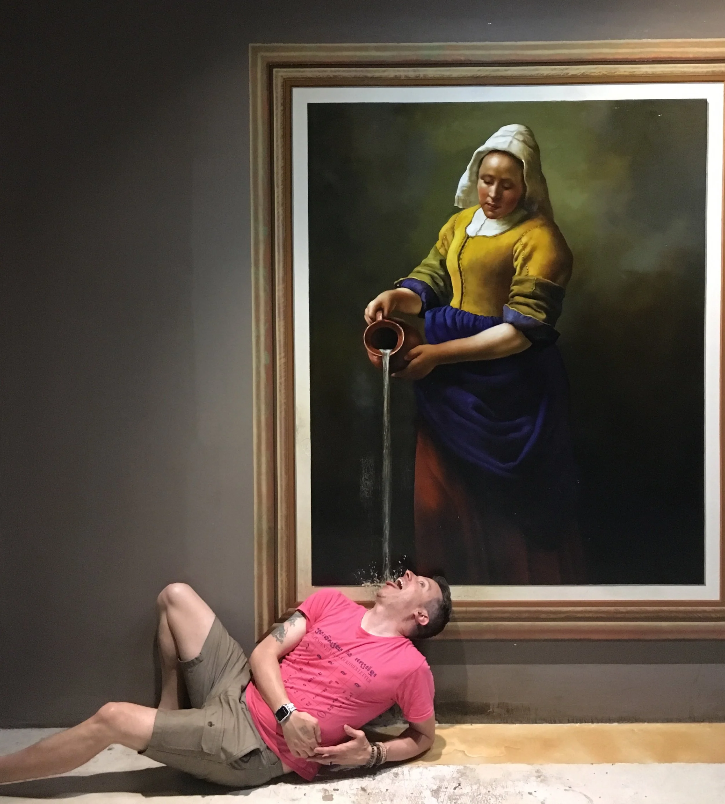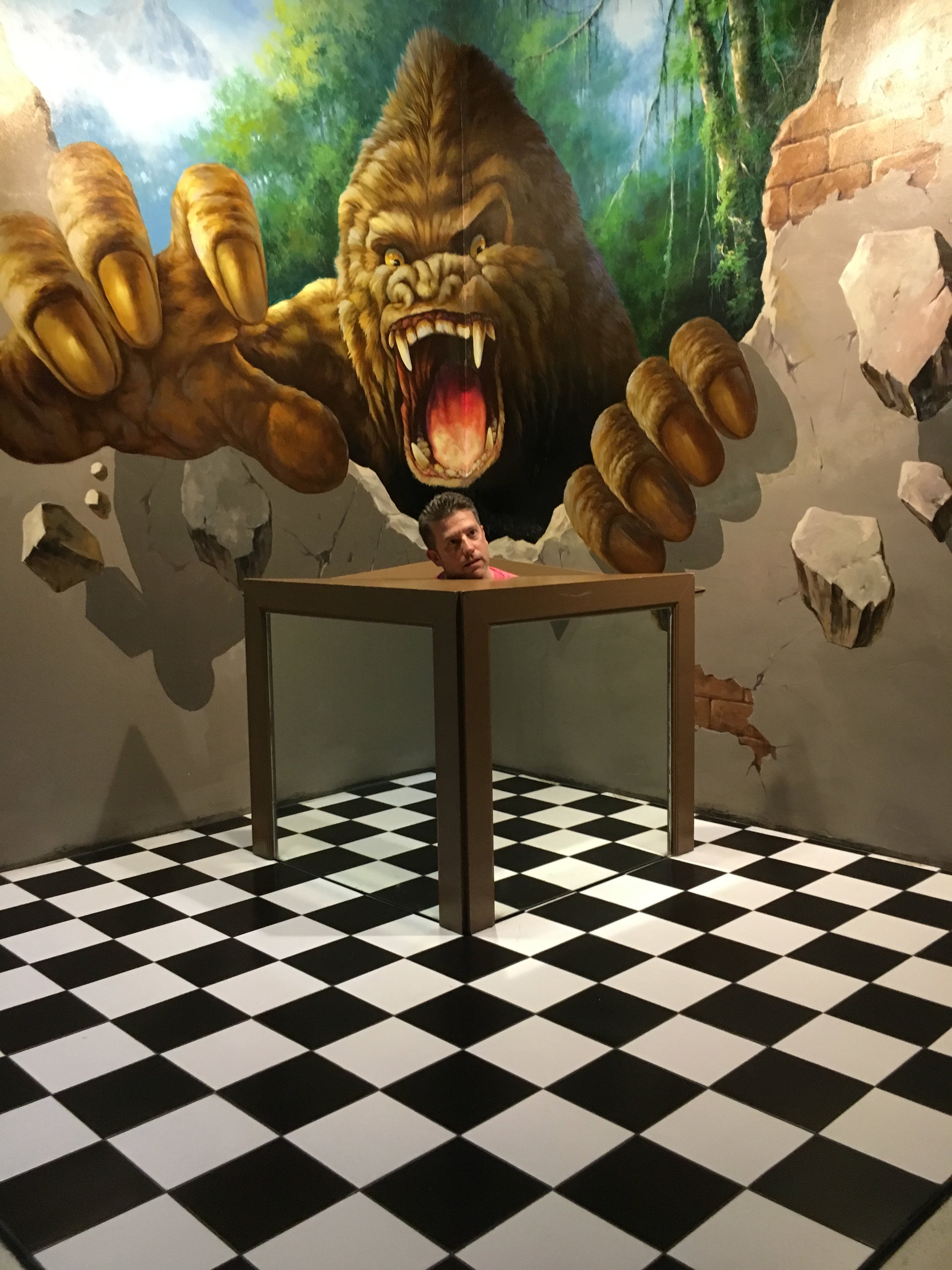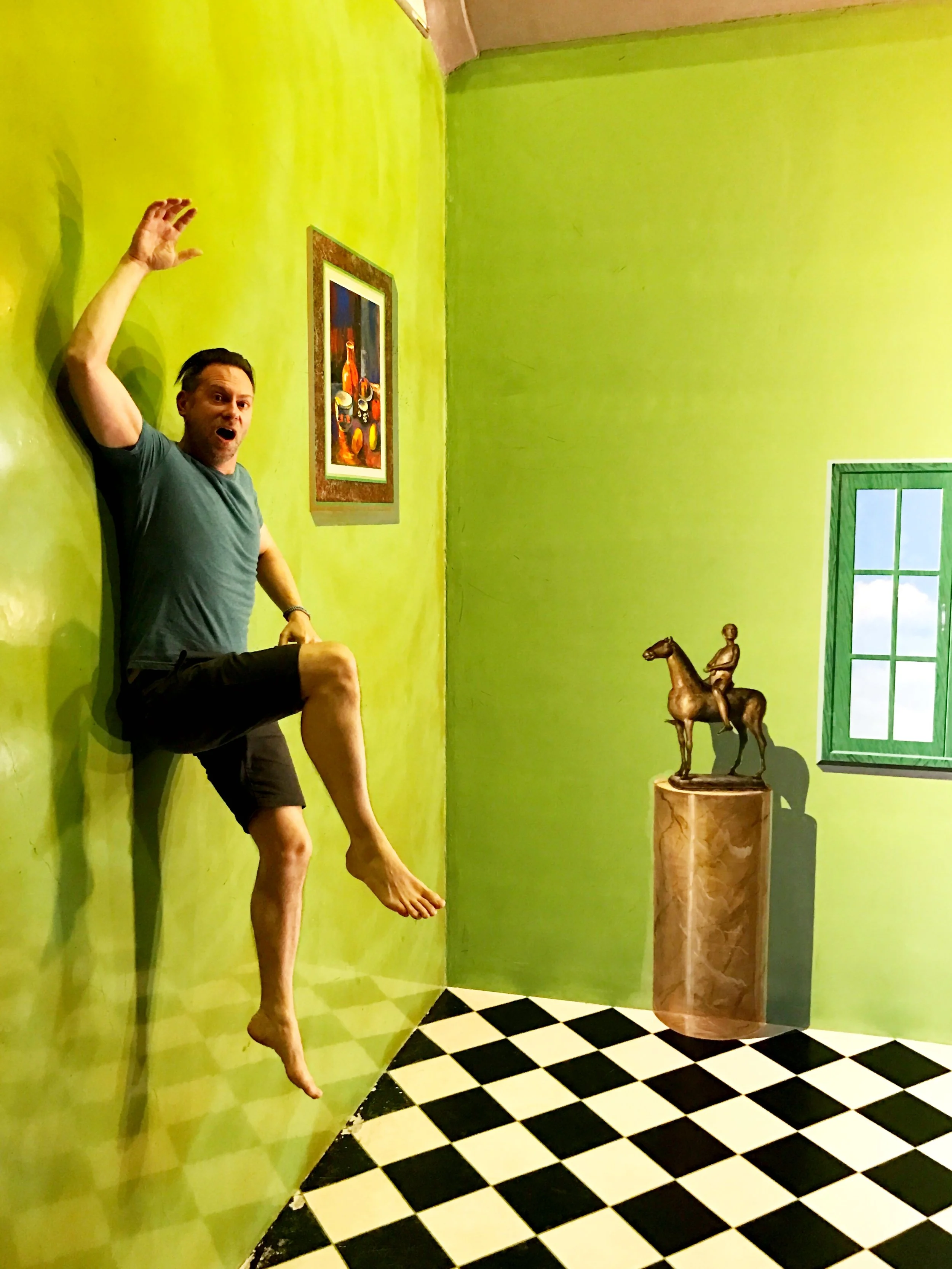 But what are the pictures everyone asks us about? The goofy trompe l’oeil photos we took at Art in Paradise. And really, who could argue? They’re mind-blowing. They’re hilarious.