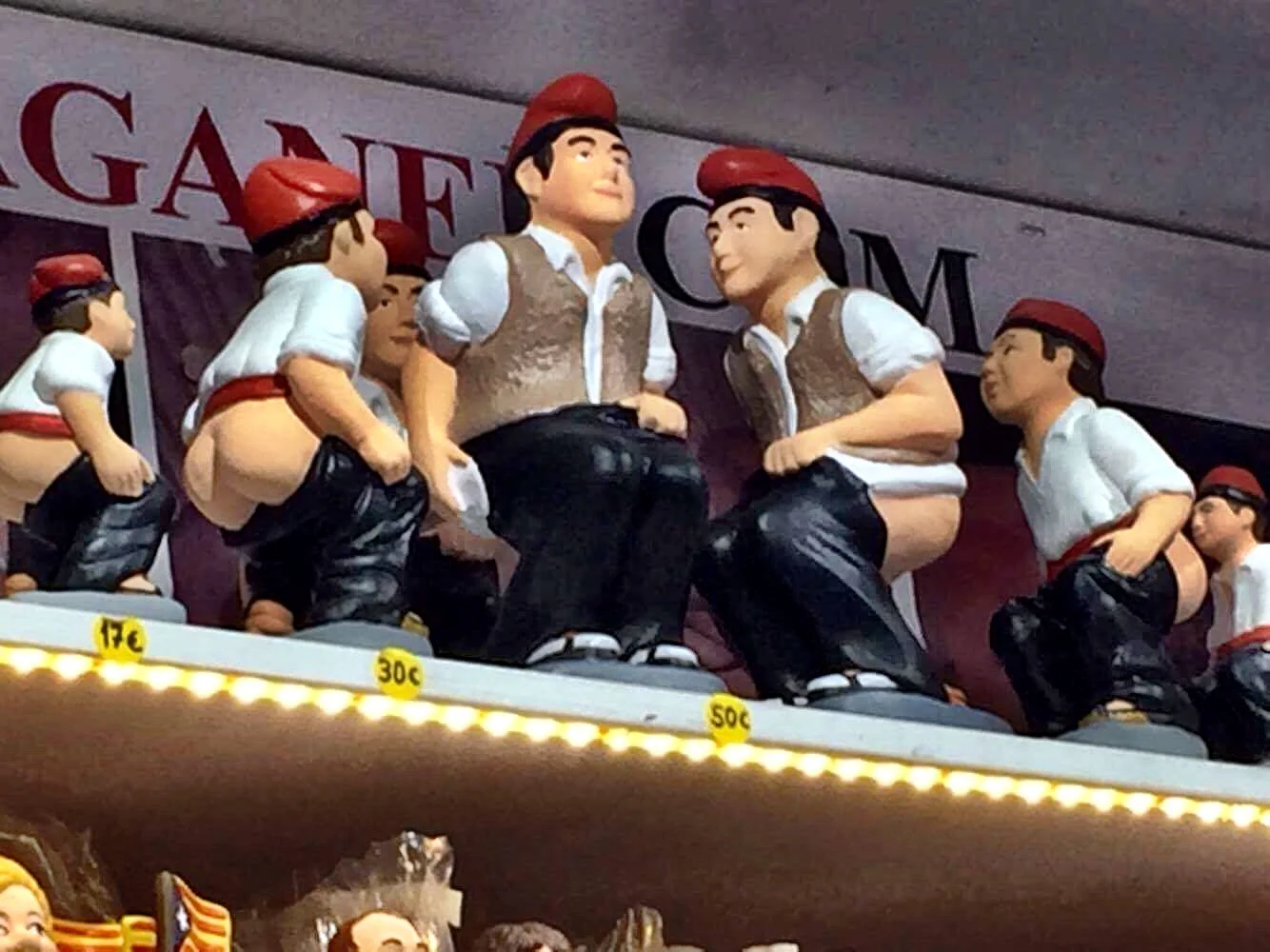He’s a cheerful little guy dressed in a traditional Catalan outfit: white shirt, red cap and belt, black pants. Innocuous from the front, there’s a surprise around back. The Caganer has his pants pulled down to expose his ample bottom — and there’s a spiral of shit at his feet.