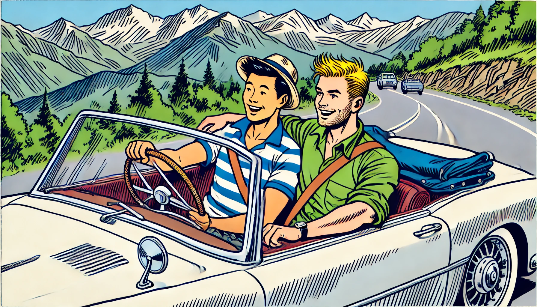 A gay couple drive a convertible tan car on the Great Alpine Road in Victoria, Australia