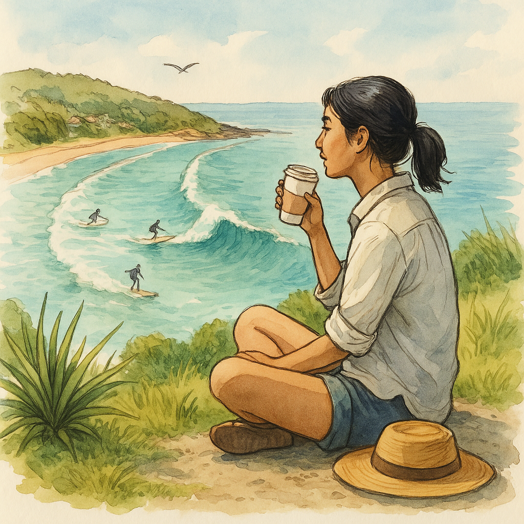 A woman sits on a hill above Crescent Head, drinking coffee and watching surfers below
