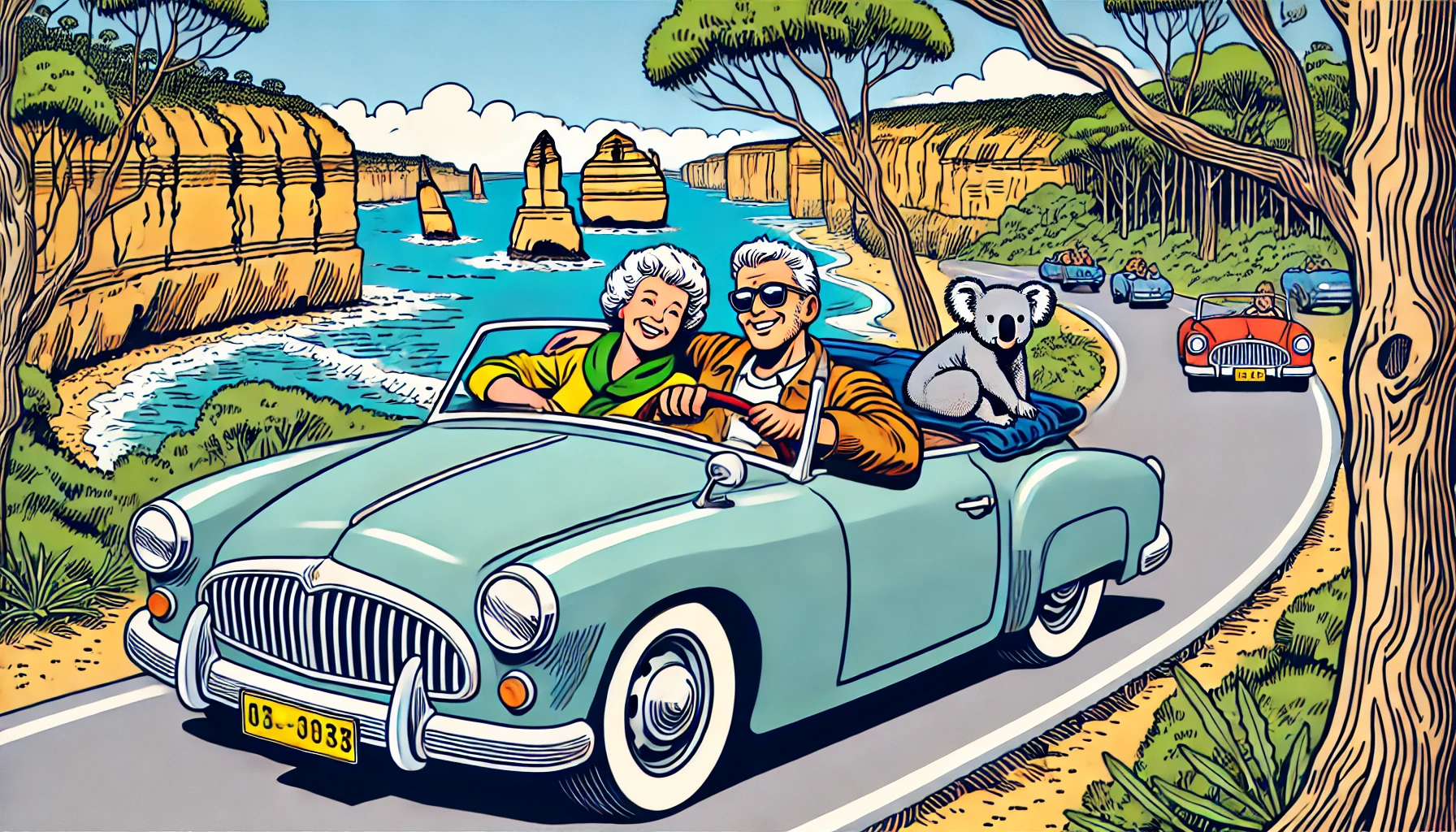 A senior couple drive a pale blue convertible car with a koala in the back along Great Ocean Drive