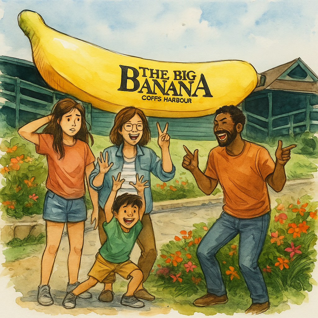 A group goofs off, posing in front of the Big Banana in Coffs Harbour, NSW, Australia