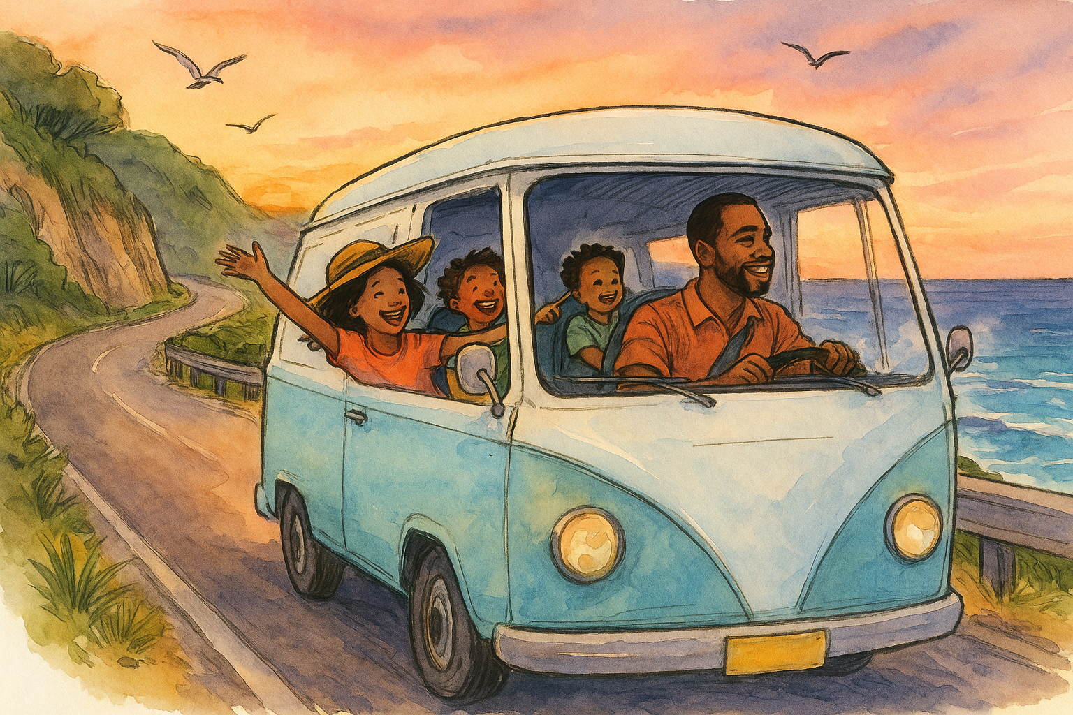 A family in a retro van drives along the Sapphire Coast, NSW, at sunset