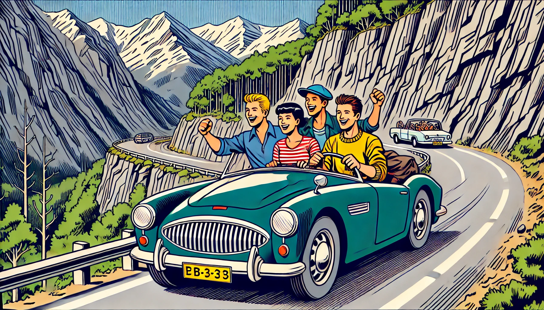 Four friends drive a small teal car along the winding mountainous Great Alpine Road in Victoria, Australia