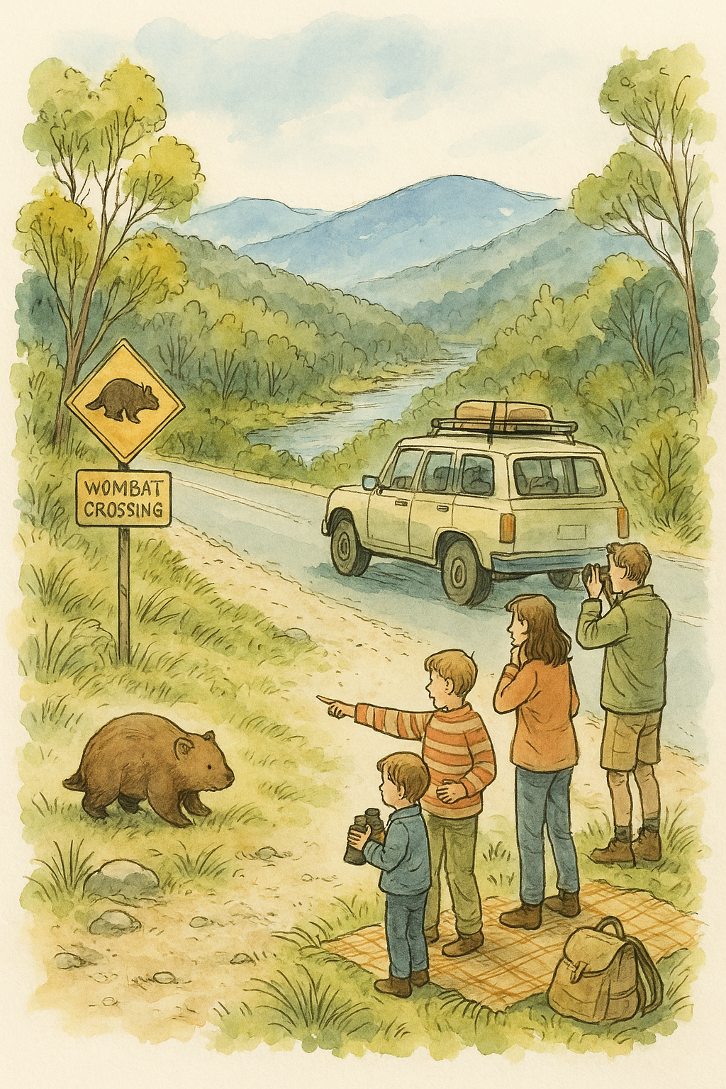 A family on a road trip on the Great River Road, NSW, stops to look at a wombat