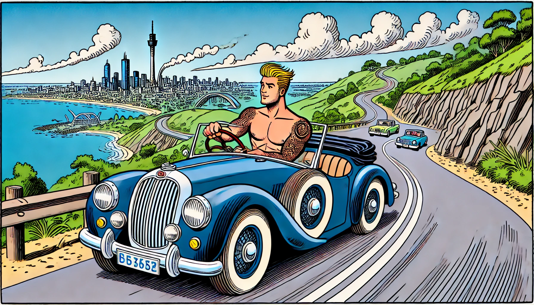 A tattooed shirtless man drives a blue classic convertible along Arthurs Seat Drive, with Melbourne in the distance