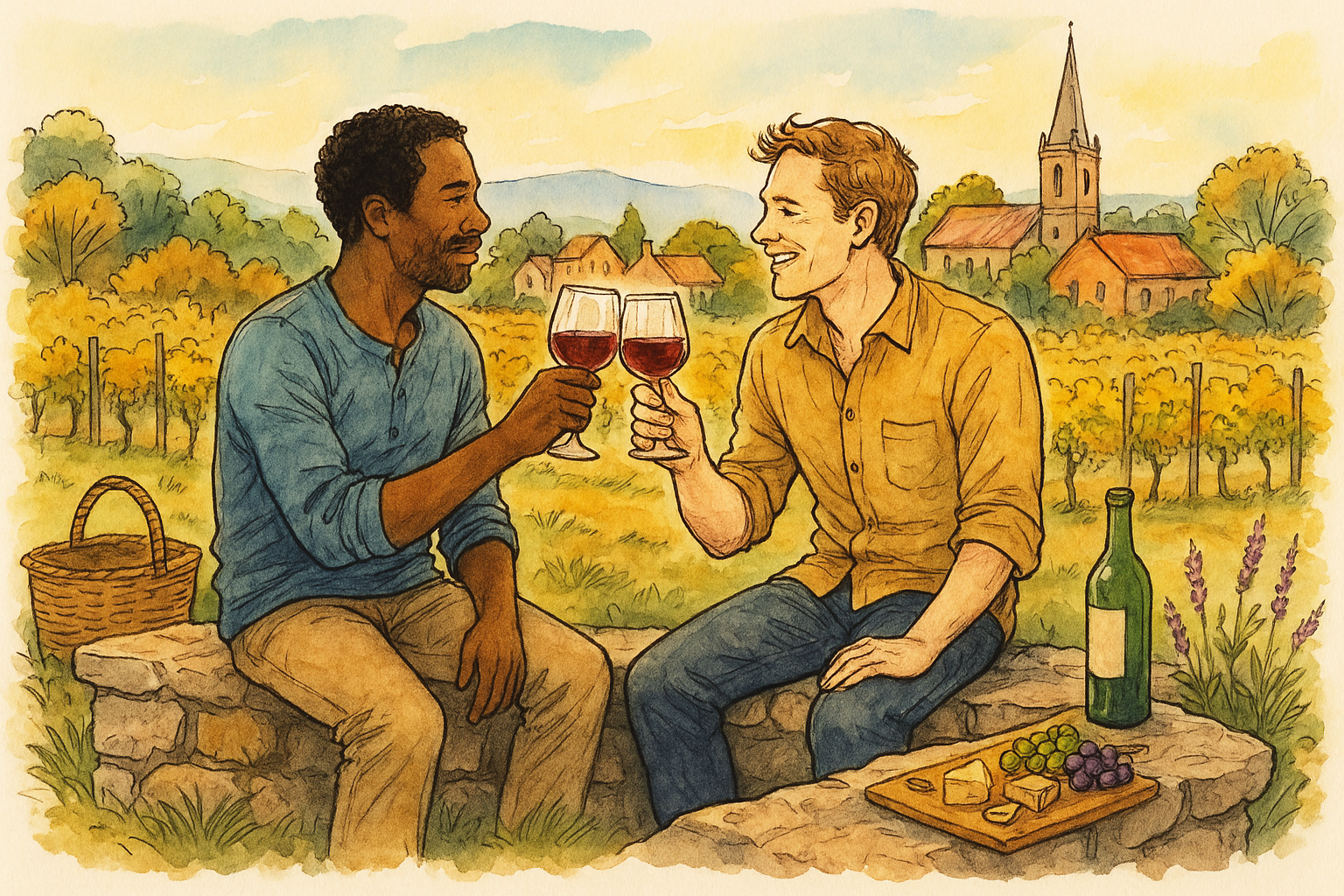 A gay couple cheerses with wine during a picnic in Millthorpe, NSW, Australia