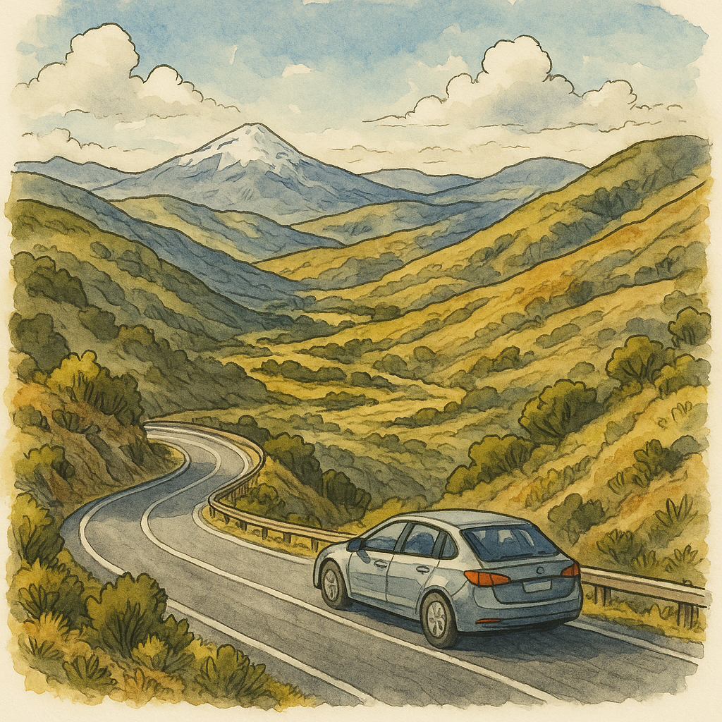 A car drives through the curving roads and hills of New South Wales, Australia, with a mountain in the distance