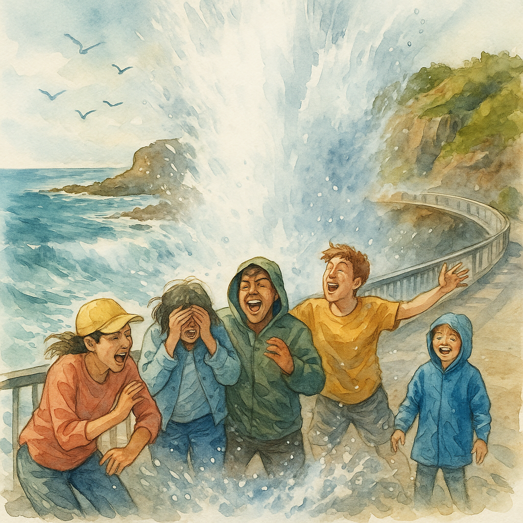 A group laughs as they get soaked by the Kiama Blowhole in New South Wales, Australia