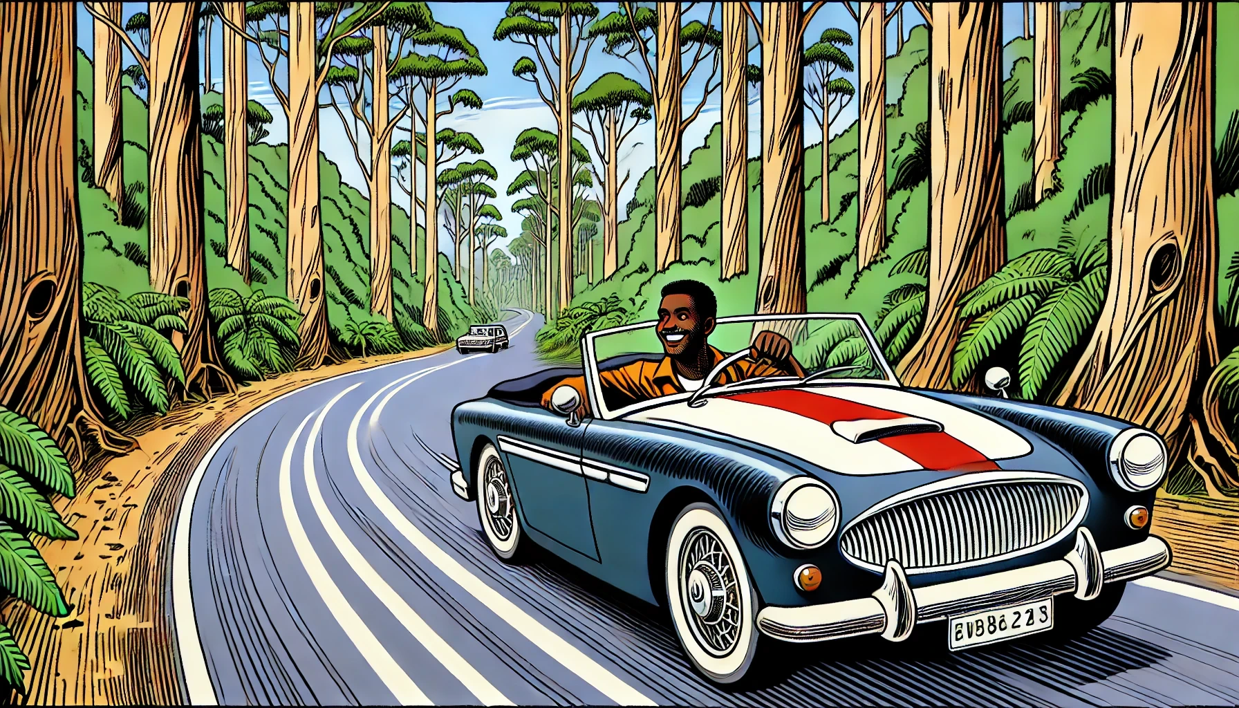 A man drives a convertible car with a racing stripe along Black Spur Drive in Victoria, Australia