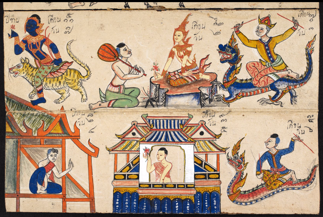 Phrommachat manuscripts include texts and illustrations of unlucky constellations for prospective couples, taking into consideration their character traits as well as their horoscopes. The pages are richly illustrated with four images of each of the 12 animals of the zodiac, combined with alternating male and female avatars, the material appearance or incarnation of a deity on earth, and a symbolic plant in which the khwan, multiple souls or life forces, resides.