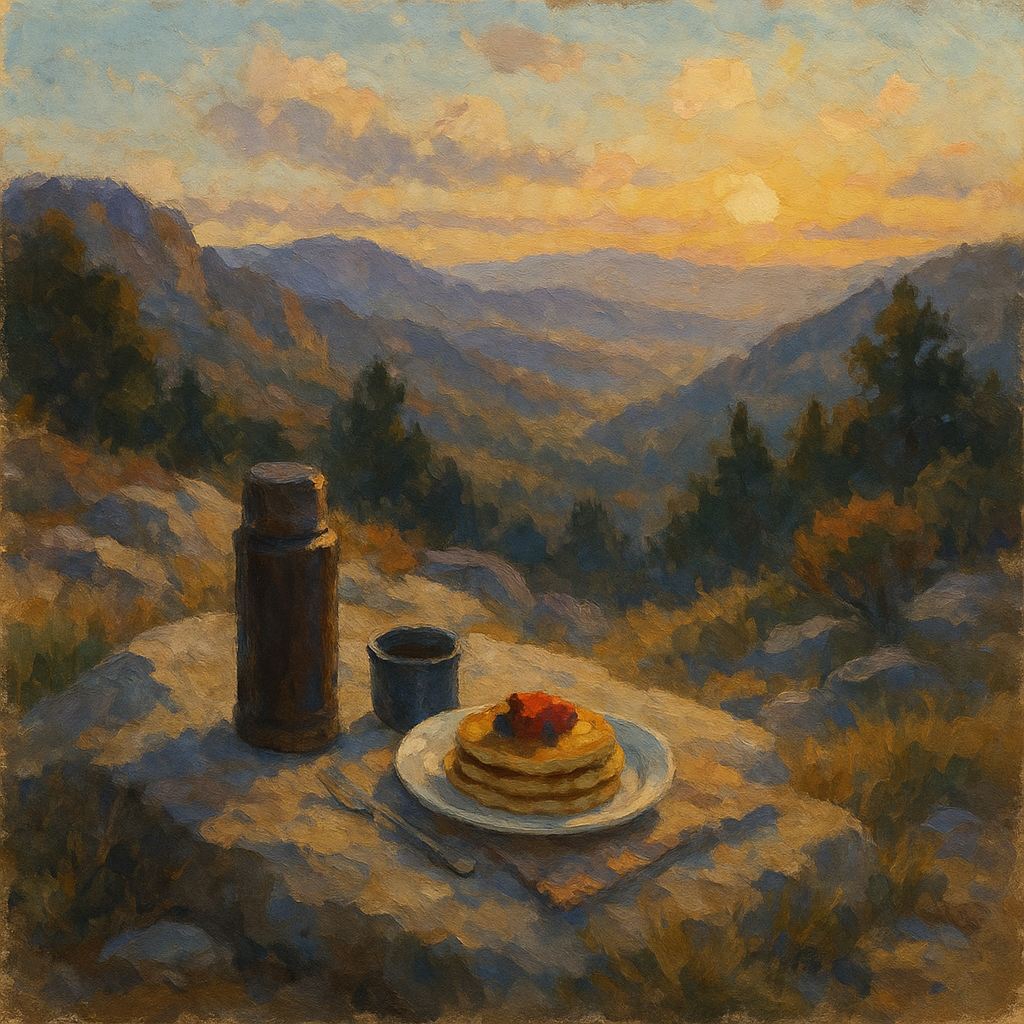 A stack of pancakes with a thermos and mug on a rock looking over the hills at sunrise