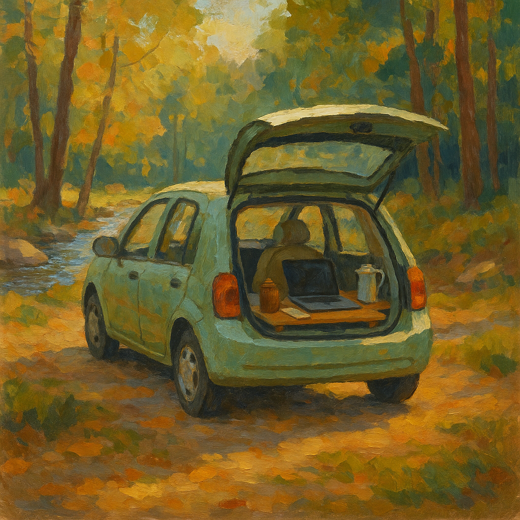 A hatchback  is open, with a workstation with laptop and percolator
