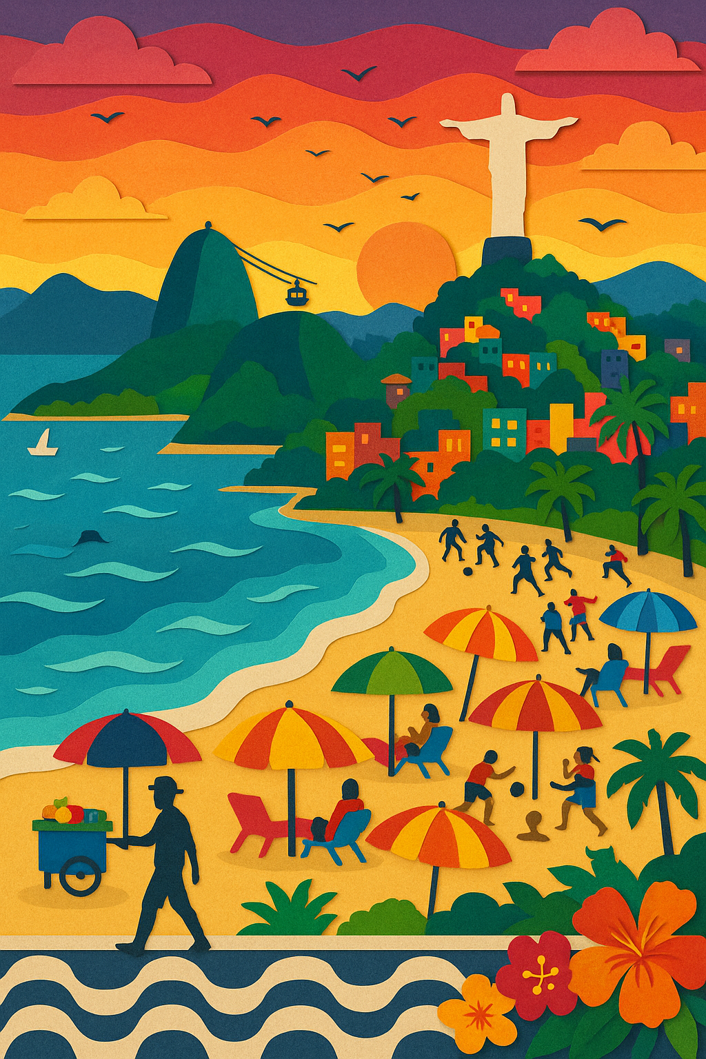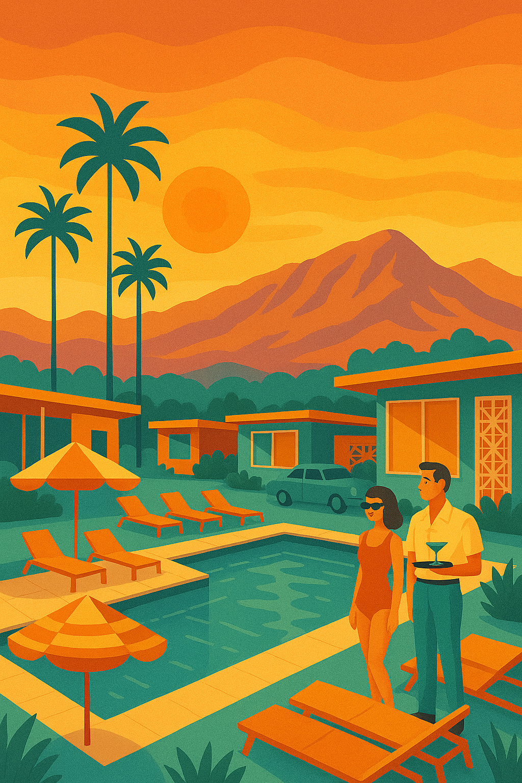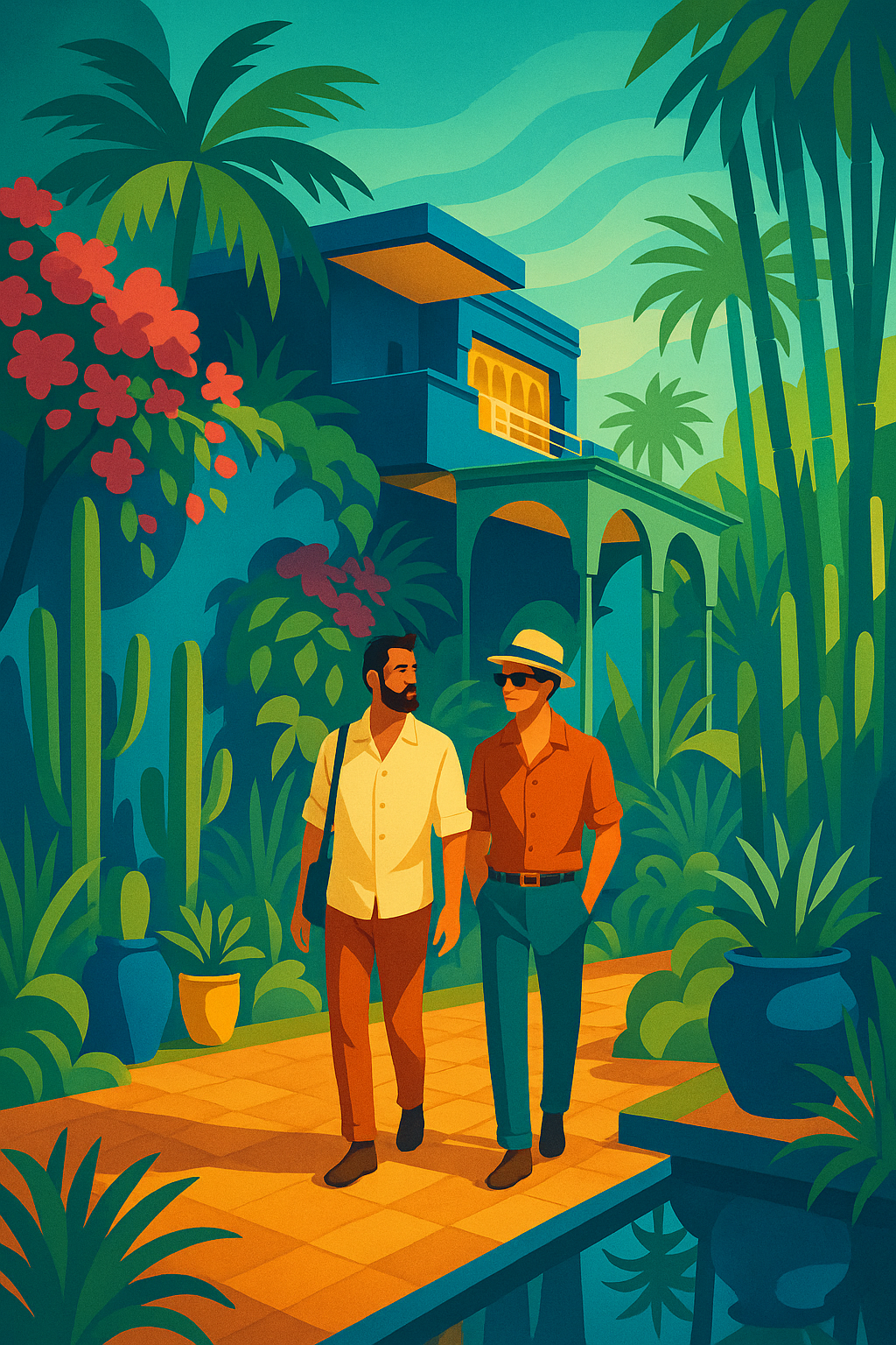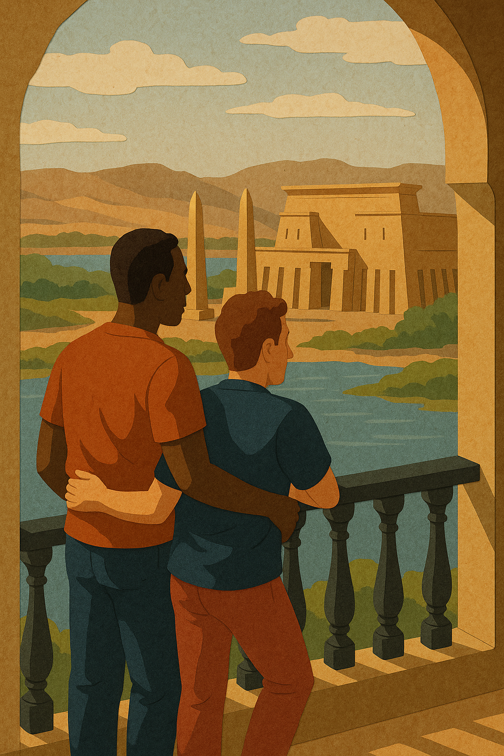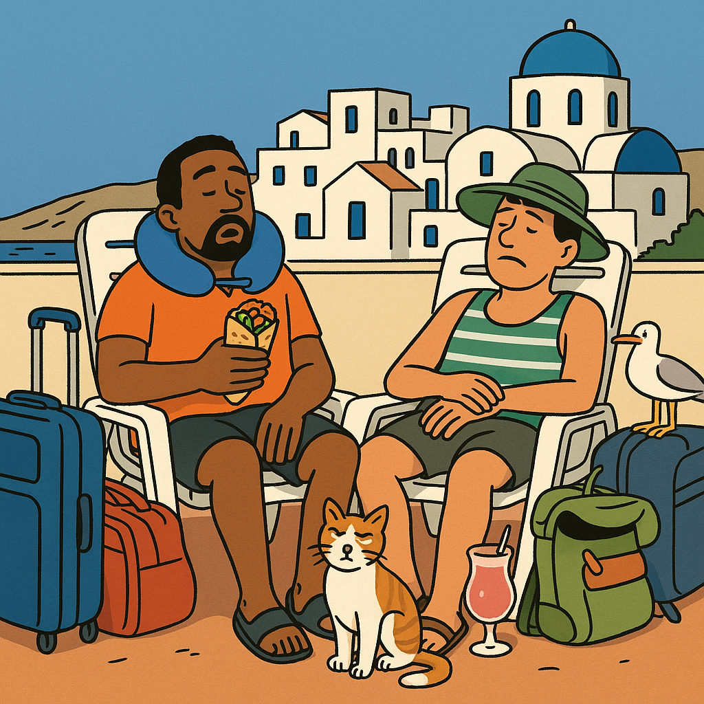A gay couple sits, exhausted, in Mykonos, Greece, one with a neck pillow and holding a gyro, the other with a tropical drink next to a cat, as a seagull stands on their luggage
