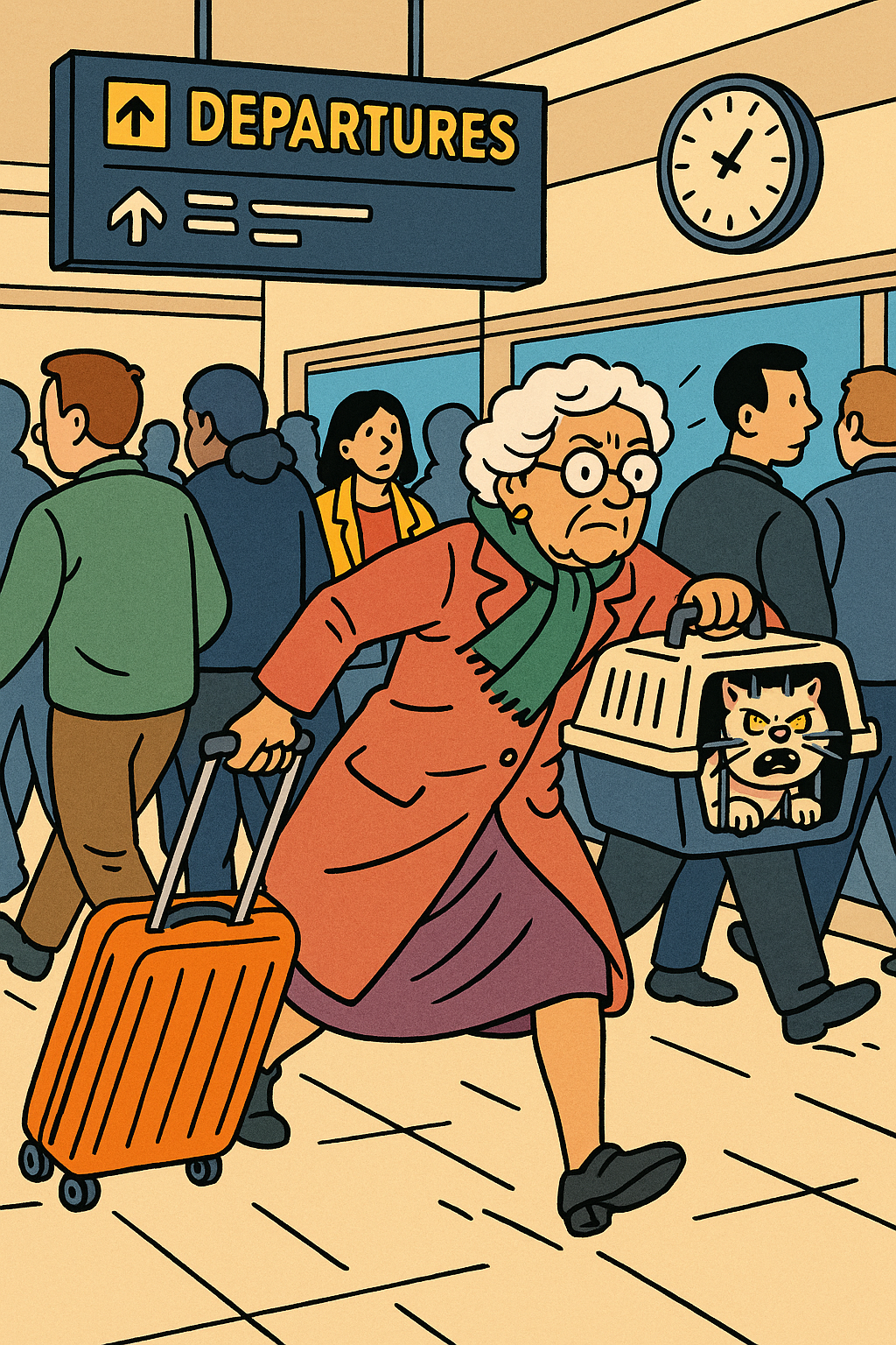 A determined, white-haired old lady rushes through the airport to make a connection, the cat in the carrier she holds upset