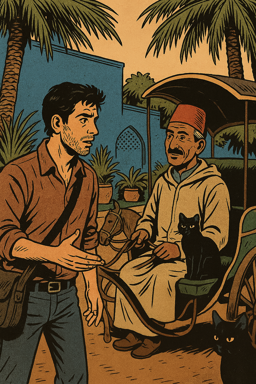A man talks with a caleche driver by two black cats in Morocco by the Majorelle Gardens