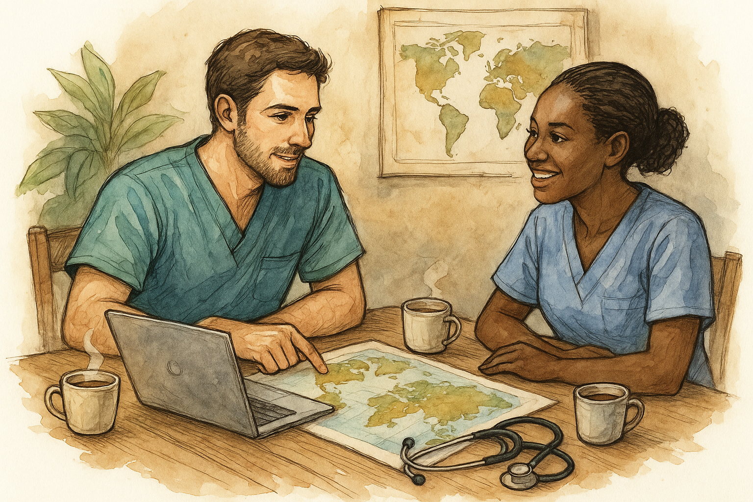 A male nurse talks to a female nurse over coffee, pointing to a map near a laptop