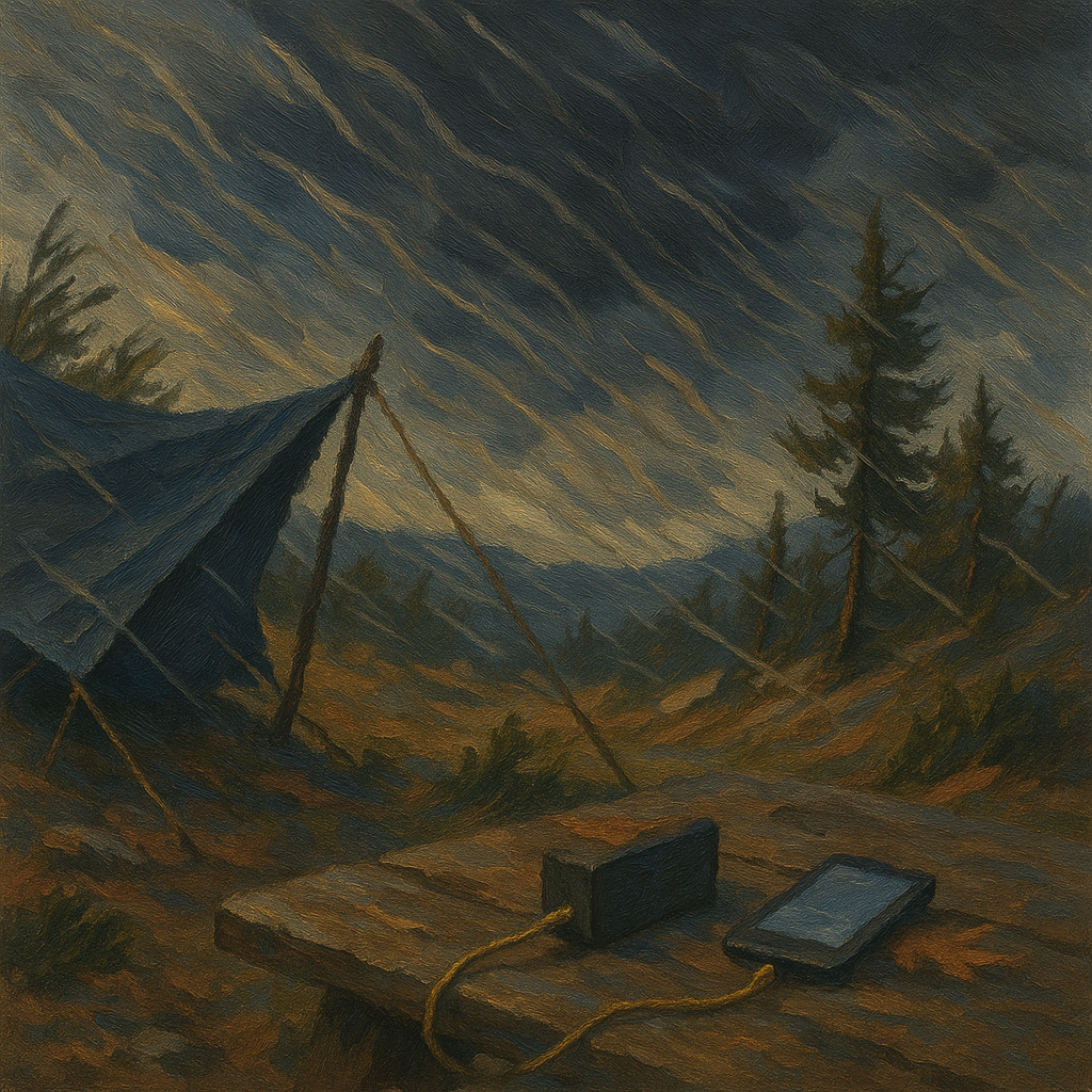 A portable charger connected to a device on a table by a tarp acting as a windbreak as a storm hits