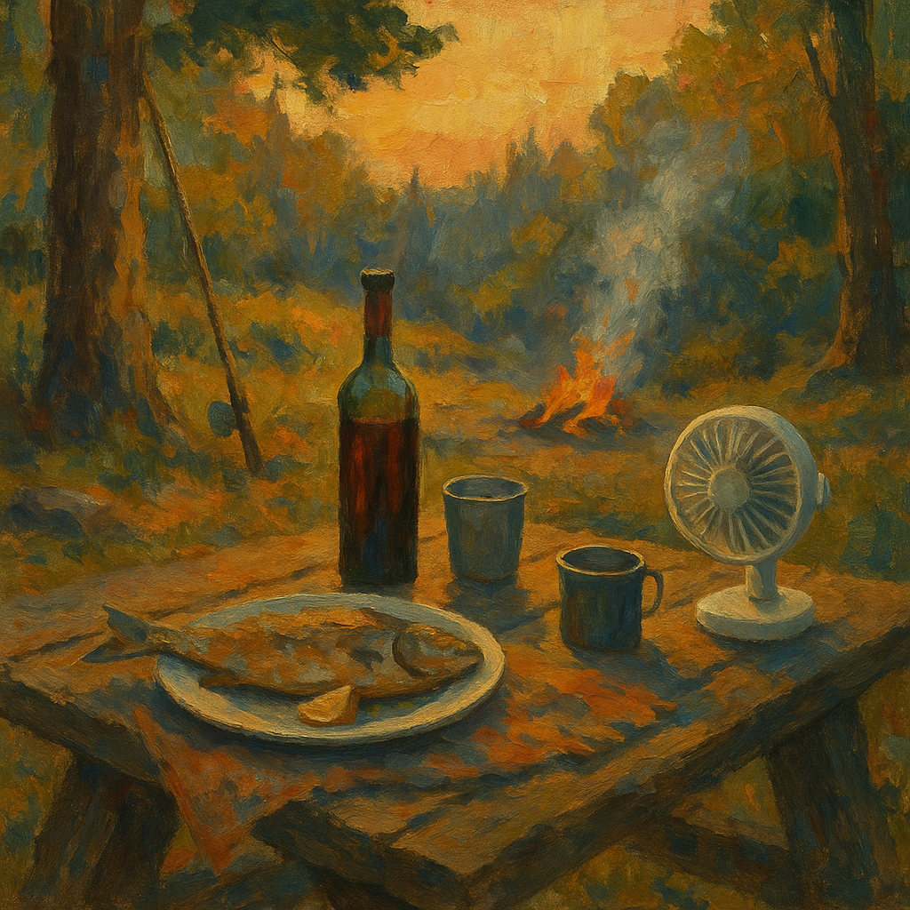 A fish, portable fan, cups and bottle of wine on a table by a bonfire in the woods