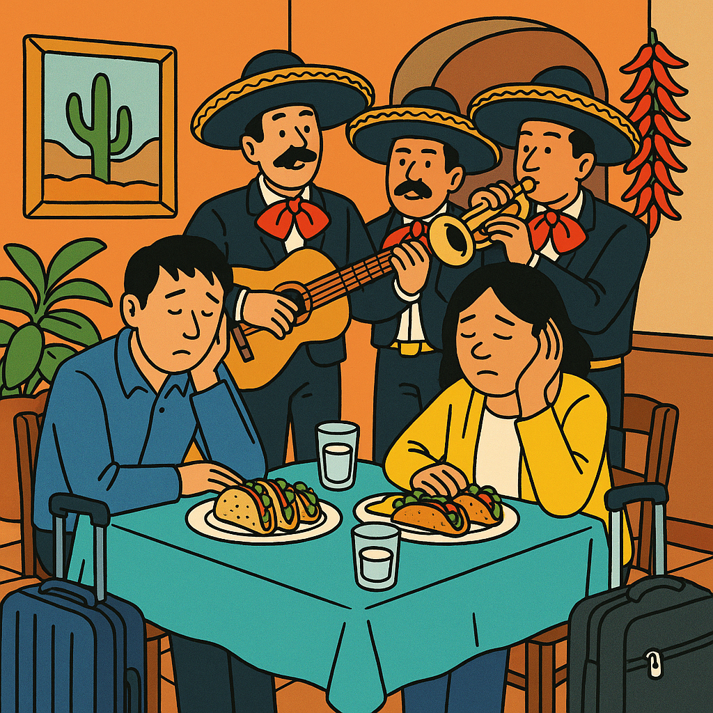 A couple are tired, holding their ears at a Mexican restaurant as a mariachi band plays behind them