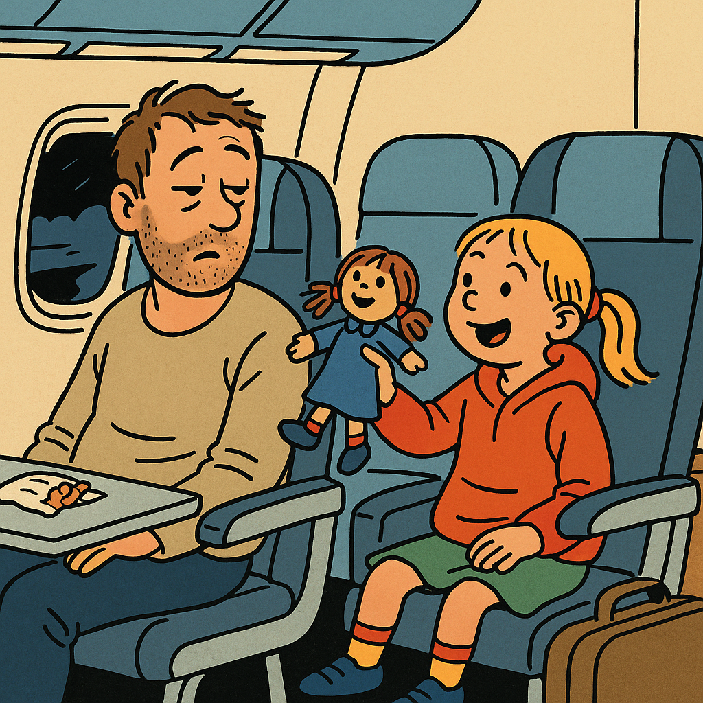 An exhausted, unshaven man sits on an airplane, looking over at a young girl in a ponytail, chatting away and holding up her doll