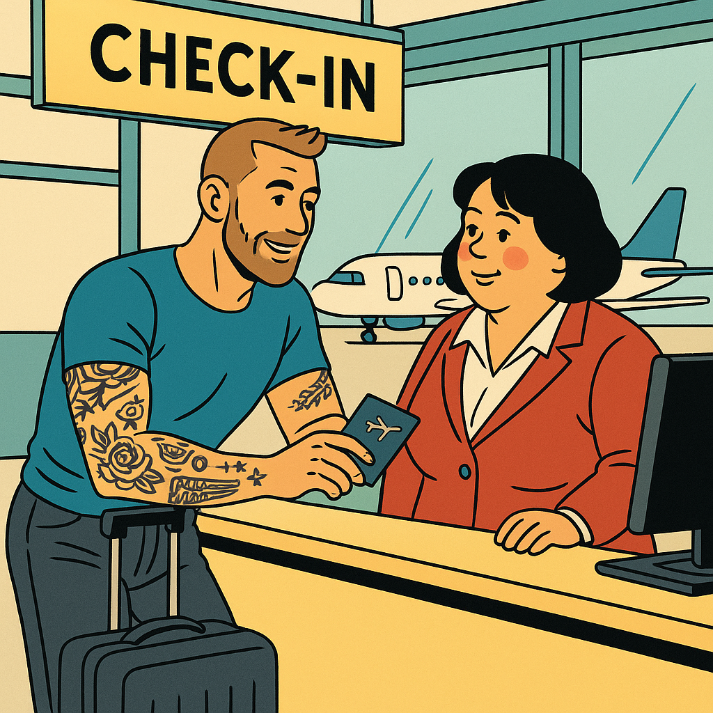 A man with tattoos on his arms and a beard flirts with the woman at the check-in counter at an airport, making her blush