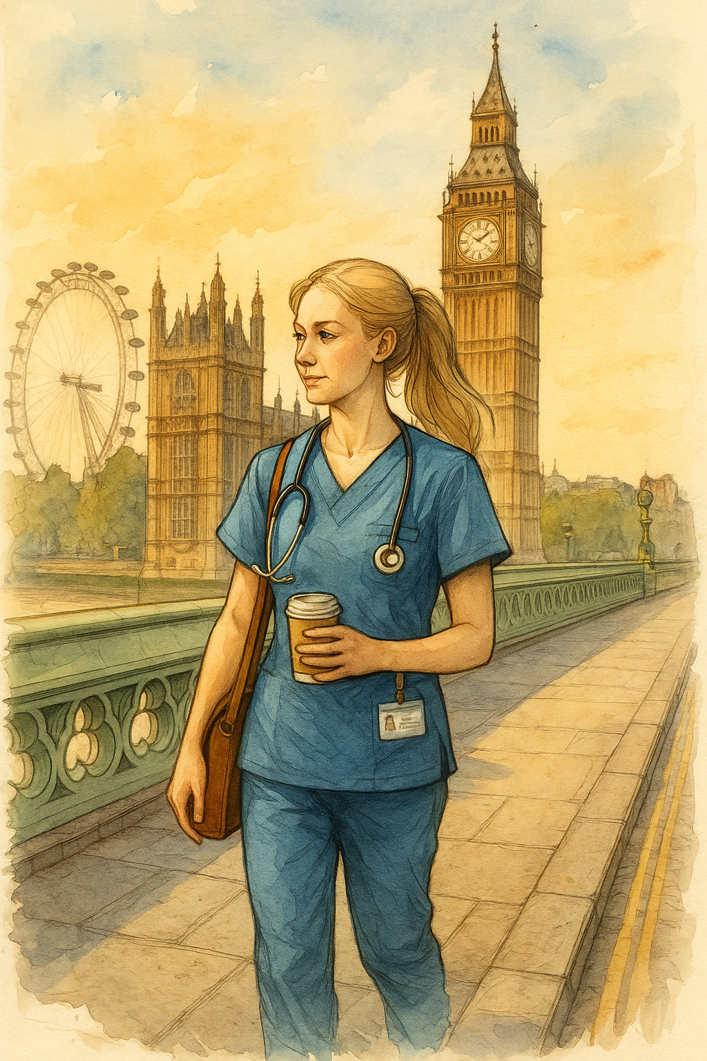 An LPN walks across a bridge in London, with the London Eye, Parliament and Big Ben in the background