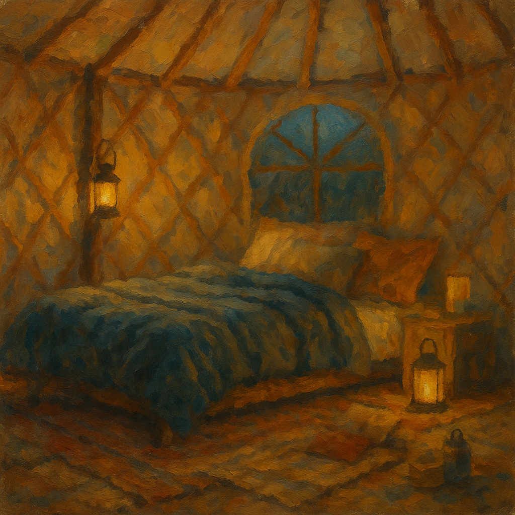 A cozy yurt with a bed, rugs and lanterns