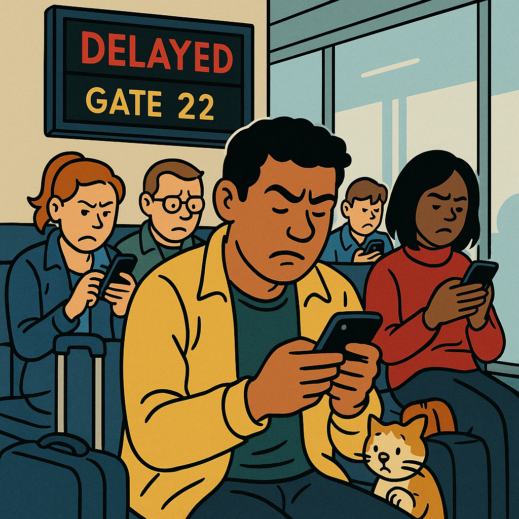 Everyone sitting in the waiting area of an airport gate are on their phones, annoyed, and a sign above their heads shows their plane is delayed, and there's also a sad cat