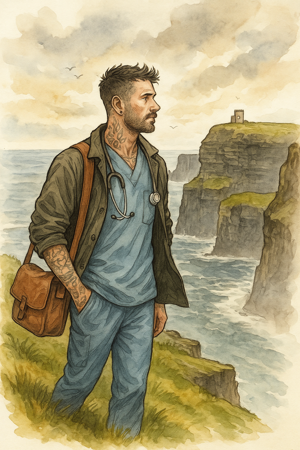 A male nurse with tattoos walks along a grassy cliffside over the water in Ireland