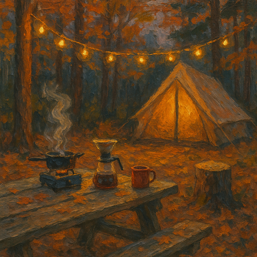 A string of solar lights hangs above a tent and picnic table with a portable stove, pour-over coffeemaker and mug