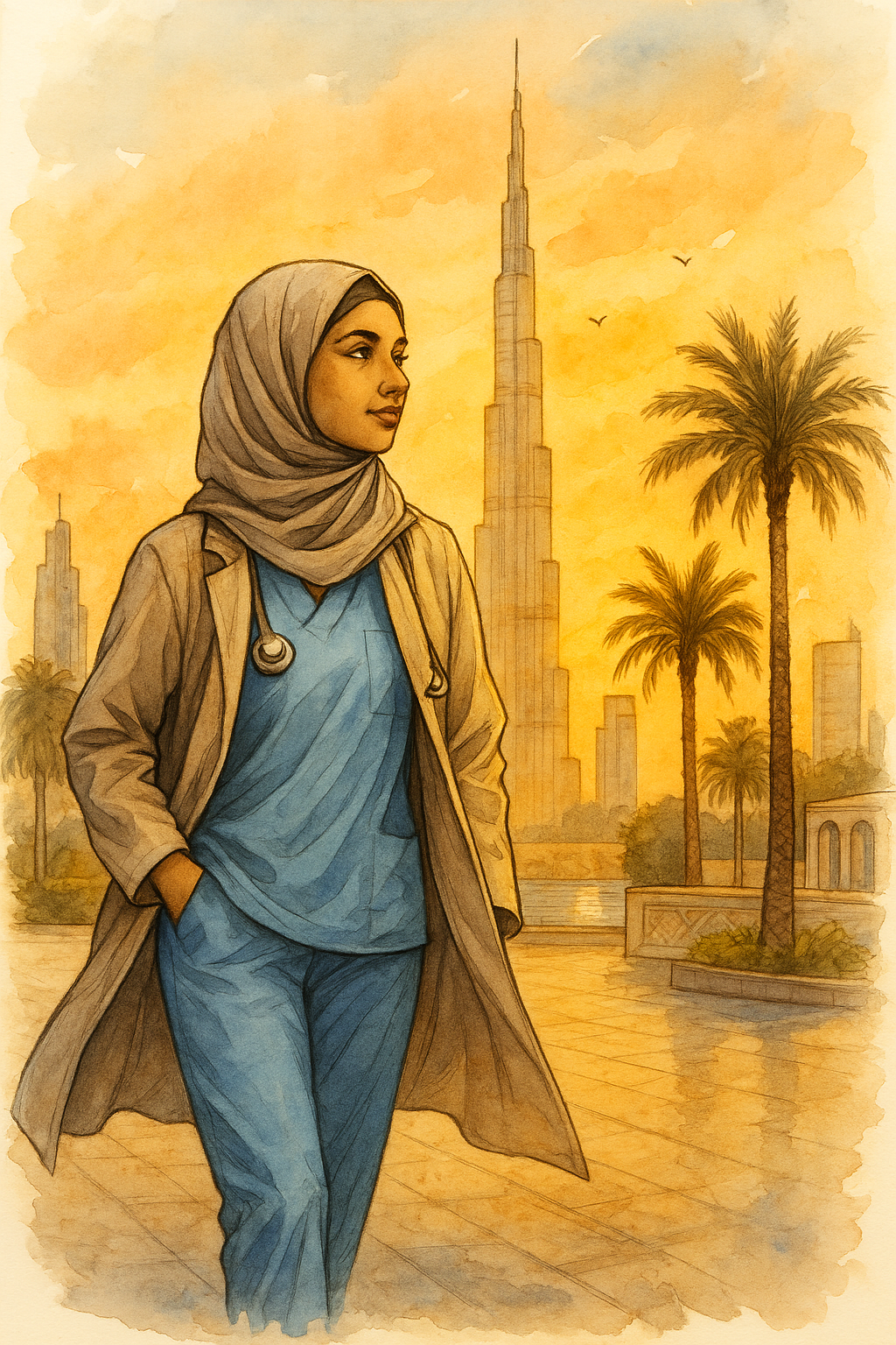 A female LPN in a head scarf walks through Dubai at sunset, the Burj Khalifa in the background