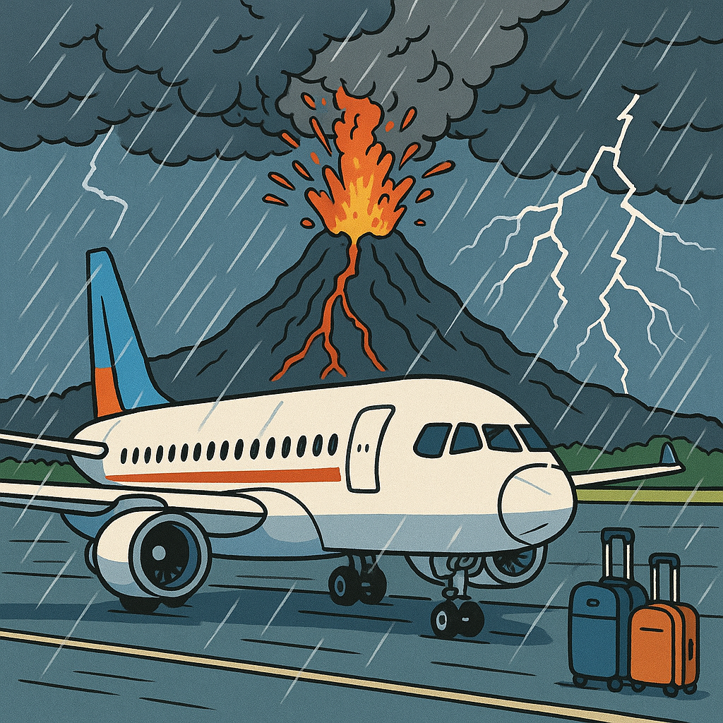 A volcano erupts lava during a thunderstorm by an airplane on the tarmac with a couple of suitcases nearby