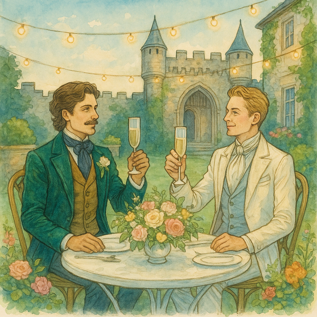 A gay couple in period dress toast champagne at their wedding at a castle in the UK