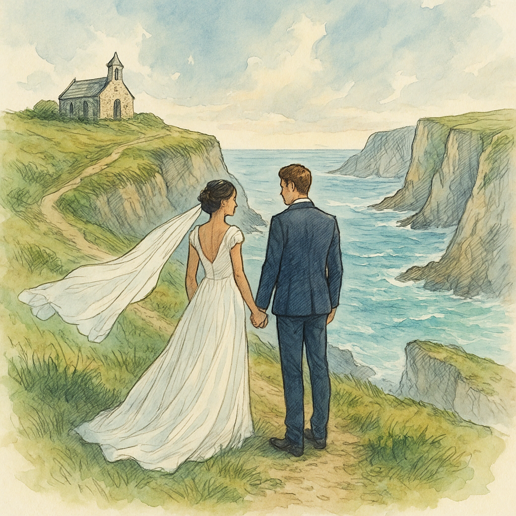 A bride and groom hold hands atop a windy cliffside in the UK, with a chapel up the hill