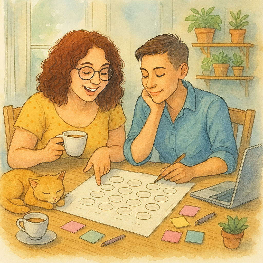 A lesbian couple finalize their wedding seating chart, while a cat sleeps nearby