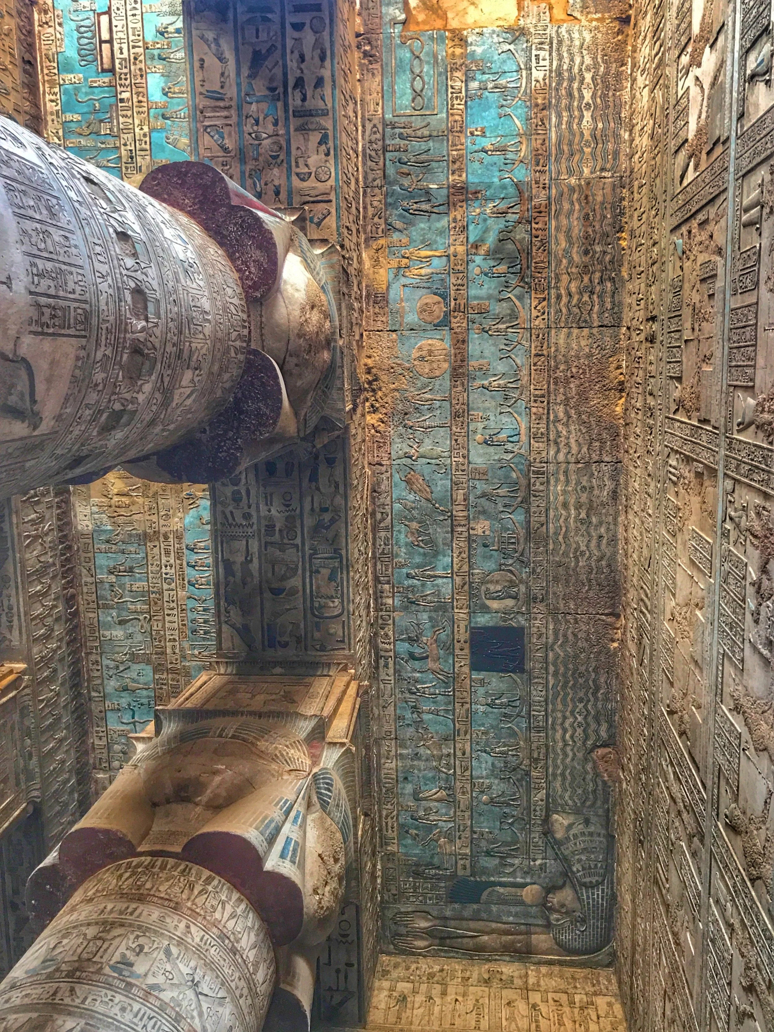 Egypt has a storied history, filled with monuments and temples that are all amazing in their own way. But some were much more astonishing than others — and Dendera (also spelled Dandarah) just might be my favorite of the bunch. Its massive columns covered in hieroglyphics utterly dwarf you, and zodialogical creatures romp on the turquoise ceiling. Then there’s the secret passage below the temple.