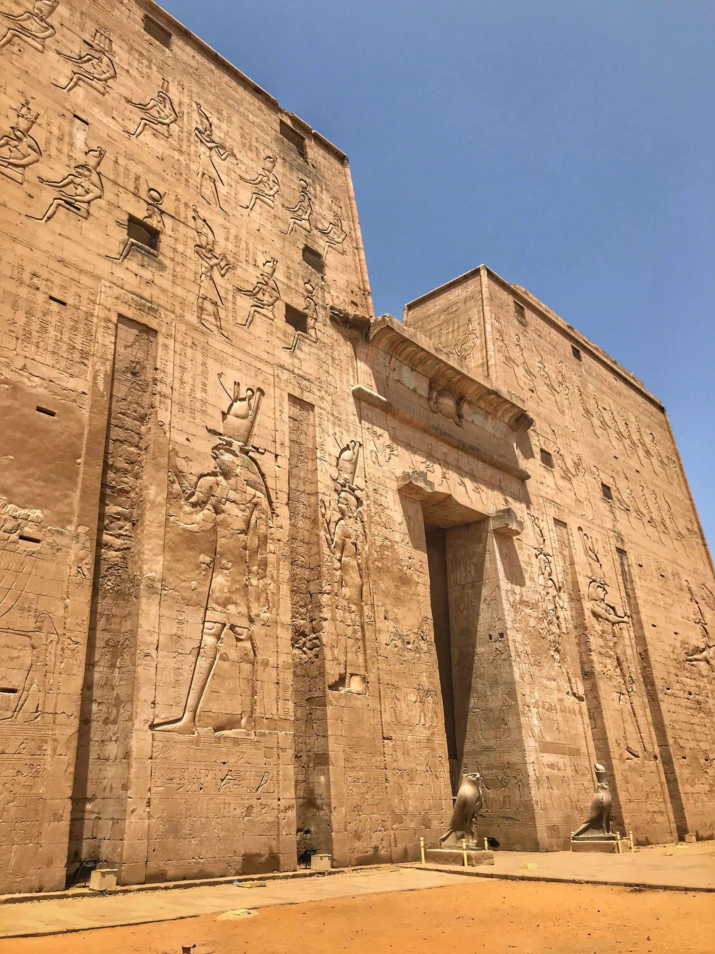 Wally stands with one of the giant falcon statues out front. They depict the god Horus, and the small person they’re protecting is none other than Caesarion, the son of Cleopatra and Julius Caesar.