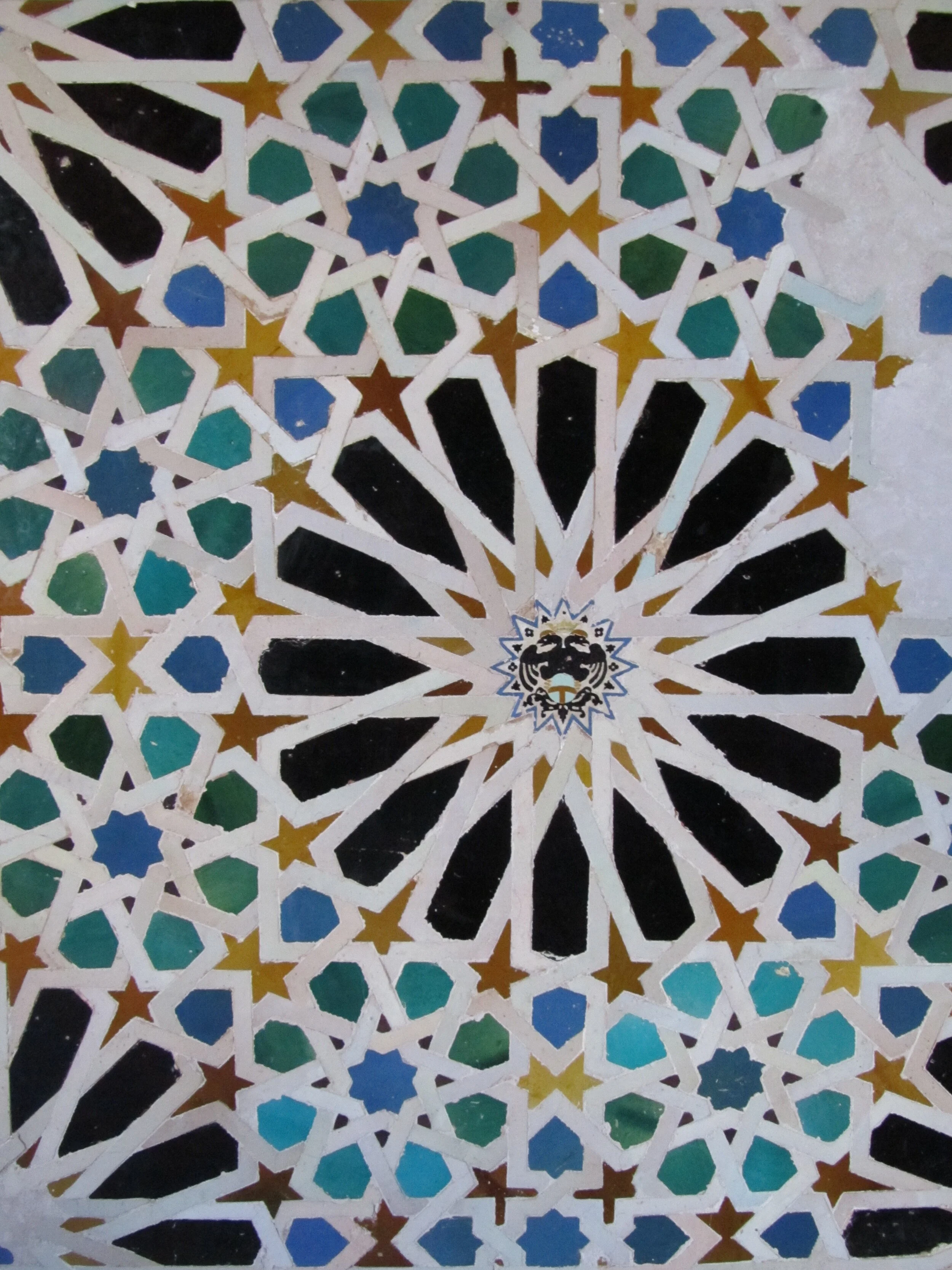 Inside the Torre de Comares is the grand reception hall known today as the Salón de los Embajadores, the Hall of the Ambassadors. Its vaulted wood ceiling is ornamented with a profusion of blue, white and gold inlay work in the shape of circles, crowns and stars, representative of the seven heavens of Islamic belief. The lower walls of the hall are covered with brilliantly colored tilework, above which horizontal bands of sinuous, vine-like kufic script are interwoven with floral ornament. One bears the inscription “Speak few words and you will leave in peace,” perhaps instructions for those requesting the audience of the sultan. I’m sure the sultan was busy, but that’s essentially like putting up a sign that says, “Keep it brief.”
