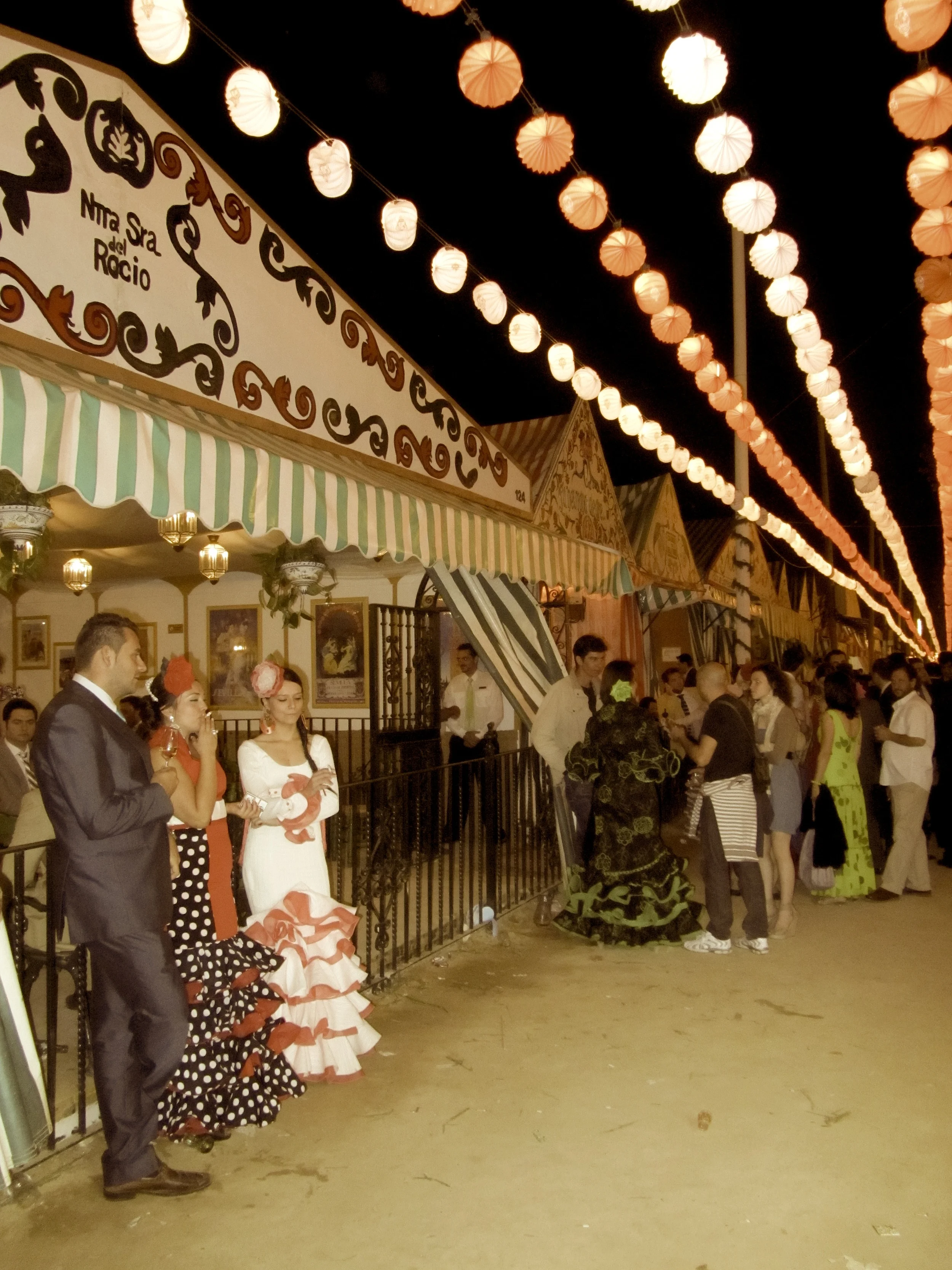 The fairgrounds in Sevilla, Spain during Feria are filled with women in flamenco dresses