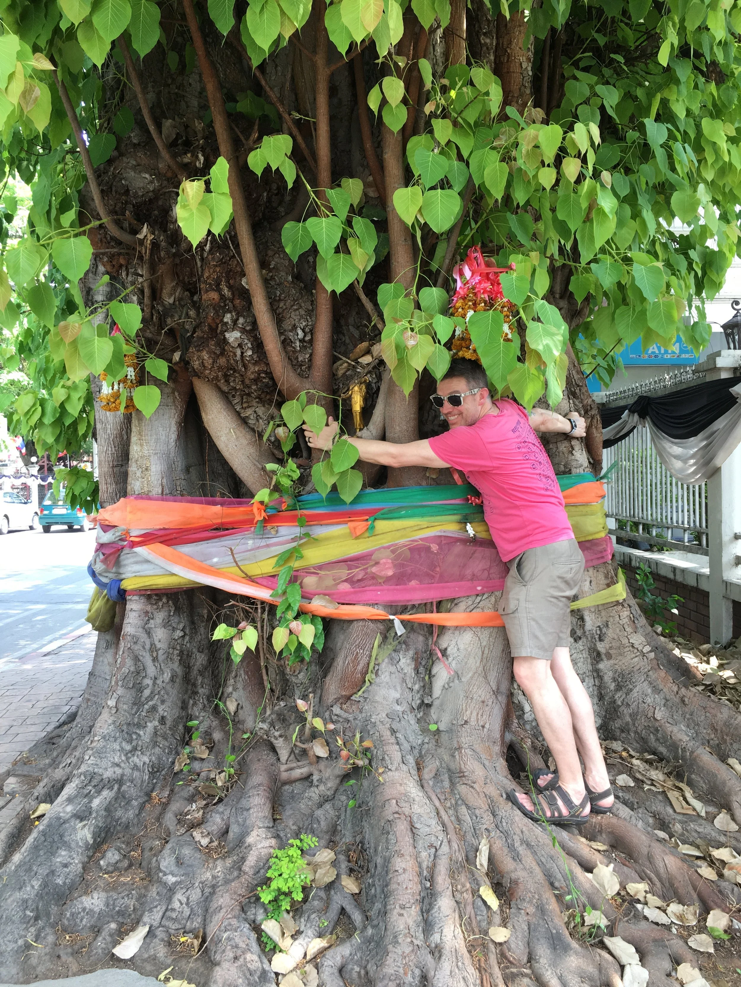 As Wally and I were following the trail that led to Mae Ya Waterfall, part of Doi Inthanon National Park, we stumbled upon a clearing with picnic tables and an impressive tree with lengths of colorful satin cloth tied around its trunk — complete with a small altar. I knew of the traditional belief of phi, or spirits, that inhabit trees, but was trying to process what the addition of vibrant jewel-toned silk women’s dresses was all about.