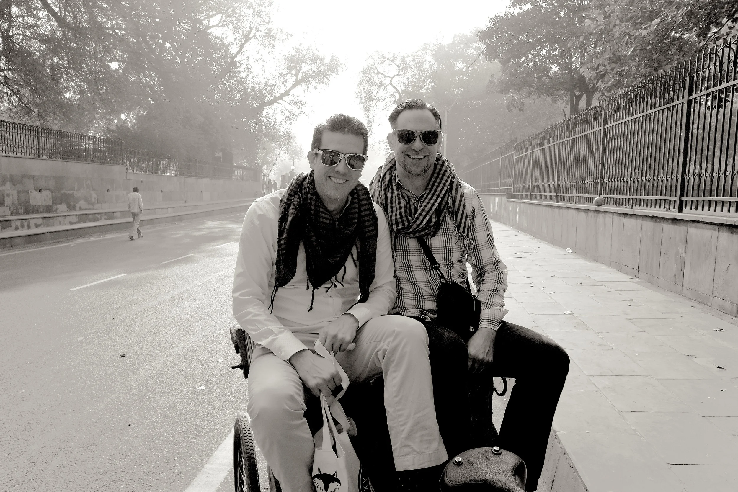 Wally and Duke precariously perched on the back of Mohammed's bicycle rickshaw, ready to explore Old Delhi