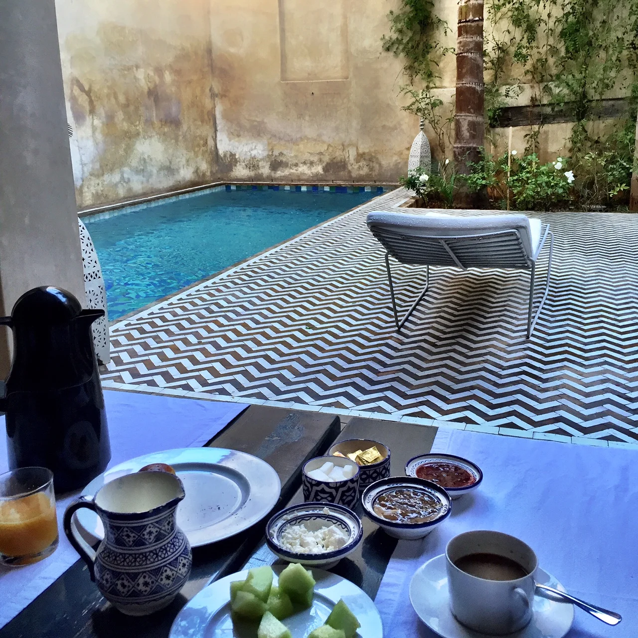A general gathering spot with plenty of seating and a small pool, the lower terrace salon was where we had breakfast every morning as well as coffee and snacks in the afternoon and a meal in the evening. The breakfast presentation of tiny blue and white tangine-shaped covered dishes inspired us to purchase a set of Fès blue pottery to use at home.