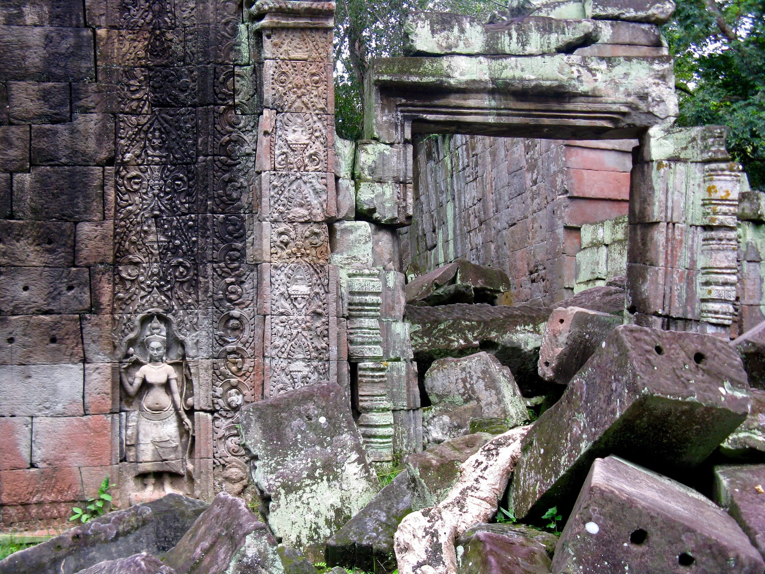 Half-hidden, intricately carved reliefs lie strewn about the site like jigsaw puzzle piece