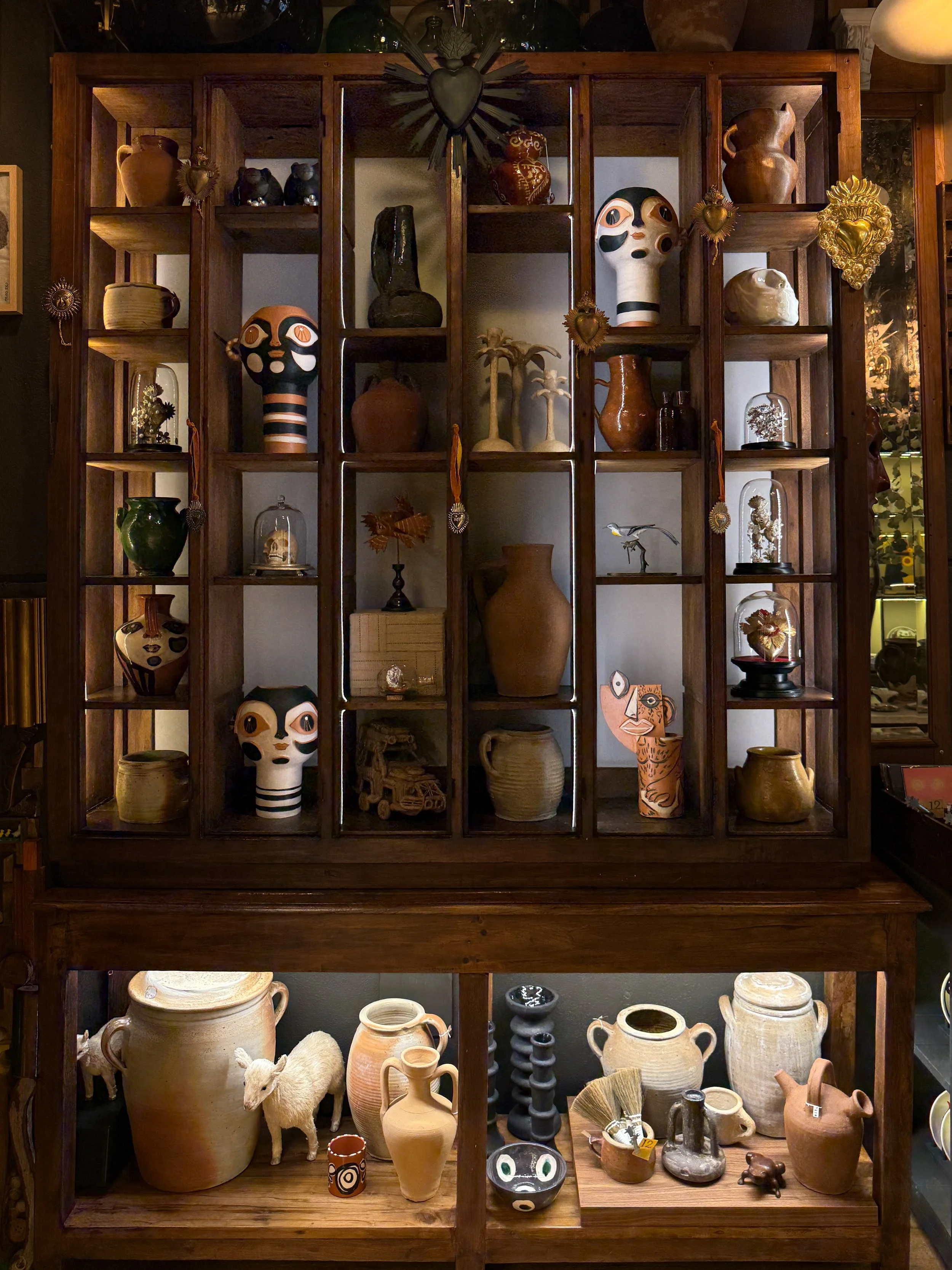 The shelves held an eclectic mix of items: ceramic face vessels and glass cloches filled with curious scenes — the Virgin Mary surrounded by seahorses, starfish and coral; a saint on horseback slaying a dragon-like creature, with a troop of toy soldiers poised for battle at his feet. Hand-painted plates of varying sizes were set among a plaster cast of a classical male nude, along with primitive carved wooden crocodiles, African tribal statuettes, and glinting tin ex-voto hearts — all arranged with a discerning curatorial eye.
