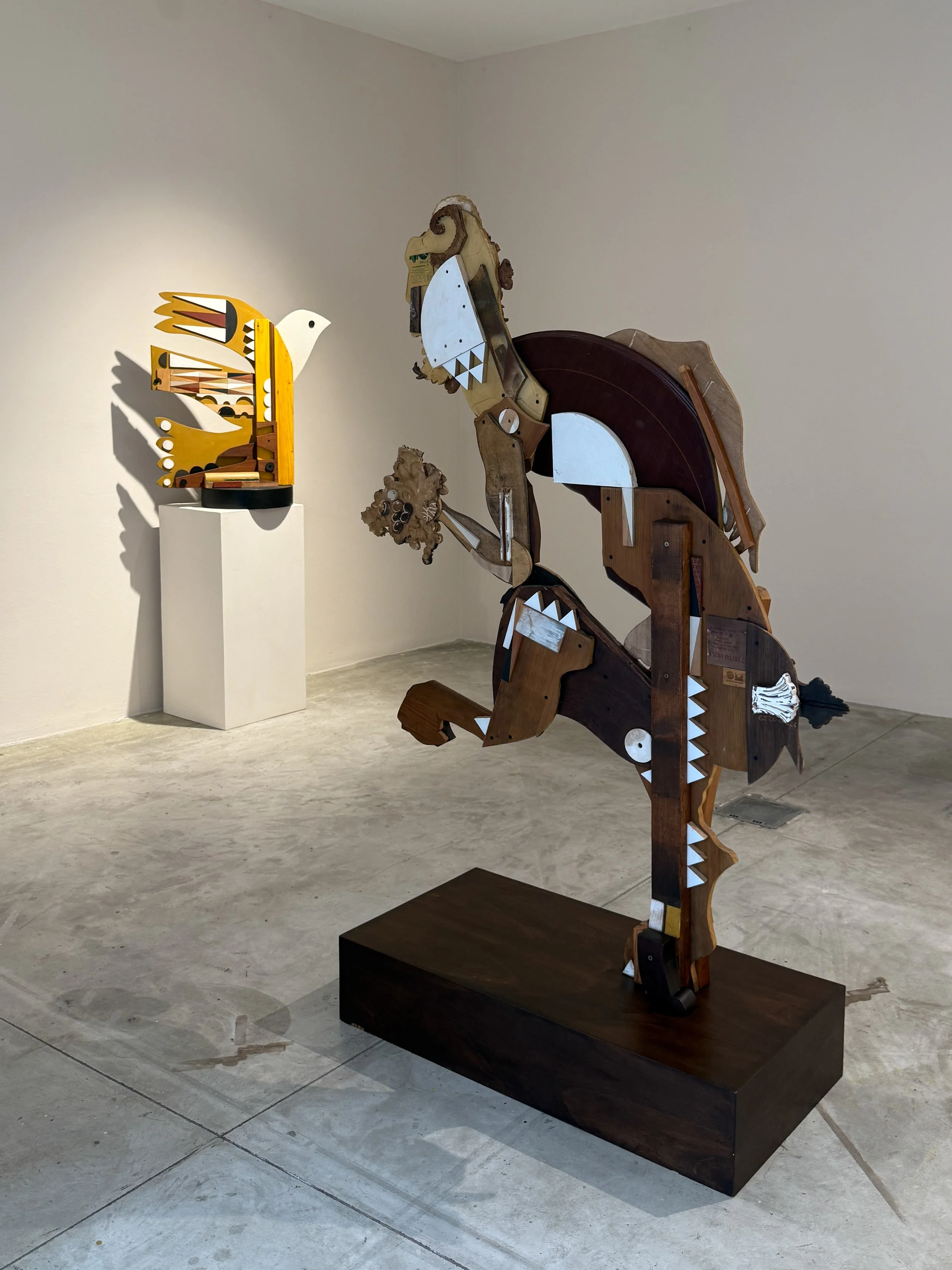 A faun and bird made of recycled wood at Oficina Marques gallery in Lisbon, Portugal