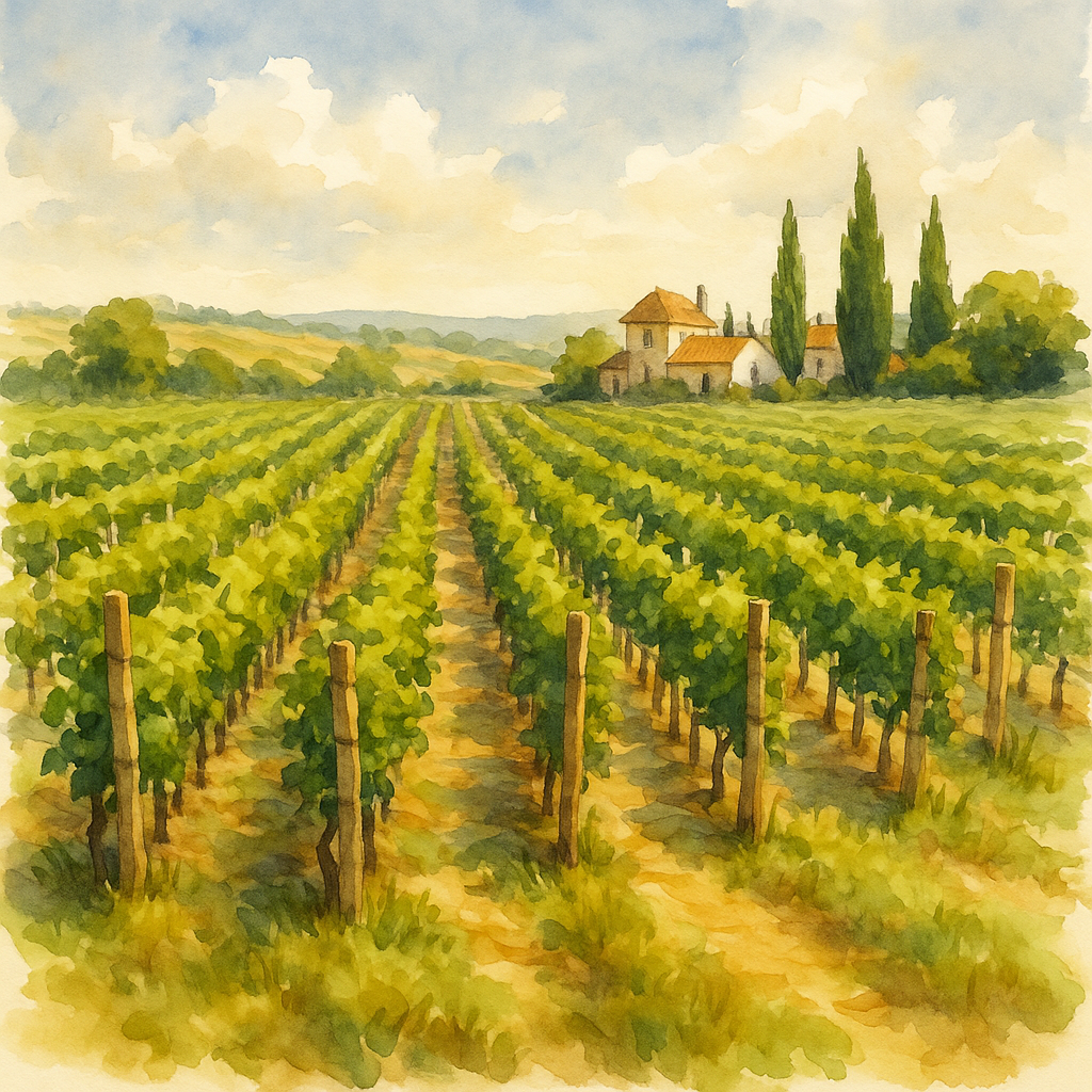 A vineyard in the Bordeaux region of France, with a white and red-roofed home in the background