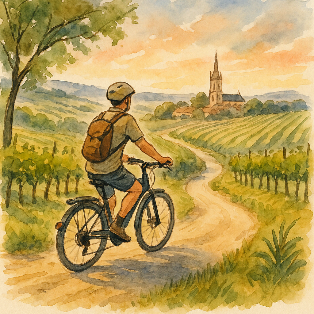 A man rides a bike along a winding path through a vineyard, with a church in the distance, in Bordeaux, France